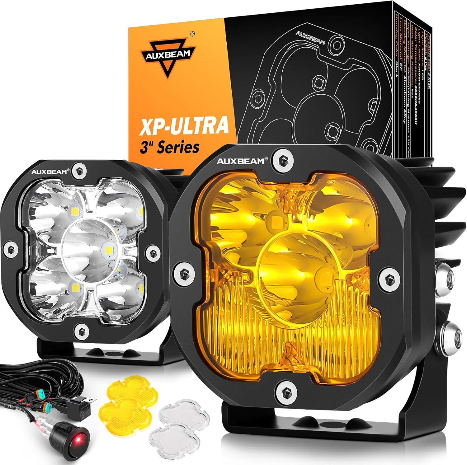 Auxbeam XP-Ultra Series 3" 80W Cube LED Pods White Spot Beam & Amber Combo Beam Replaceable Light Covers 9600LM Yellow Offroad Ditch Lights Driving Light Bar, Pair