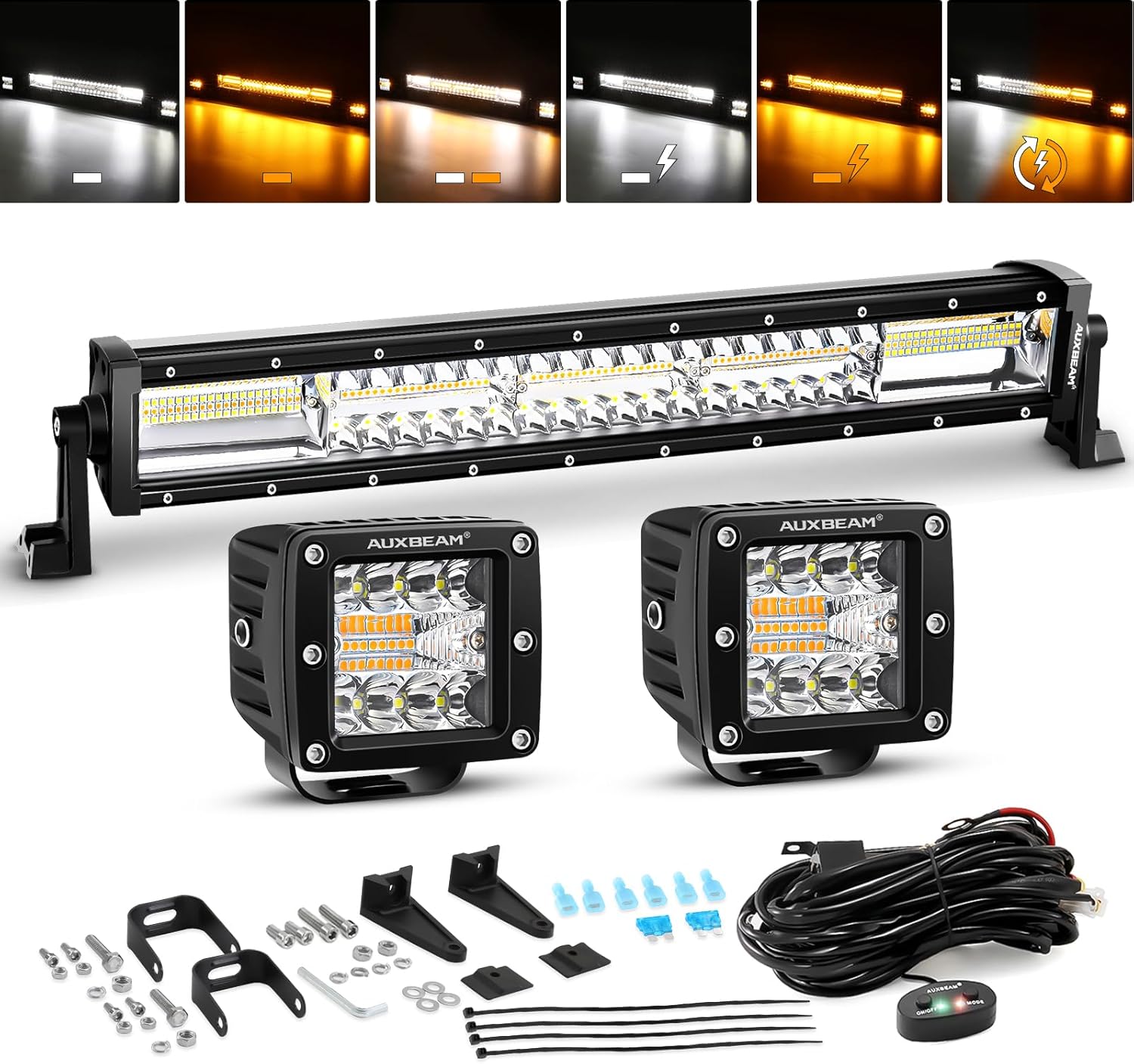 Auxbeam 22 Inch 120W LED Light Bar 2PCS 3 Inch 96W LED Pods, Amber White Fog Light 6 Modes Strobe Lights for Work Truck, Spot Flood Combo Off Road Driving Lights for Jeep ATV Utv Auto
