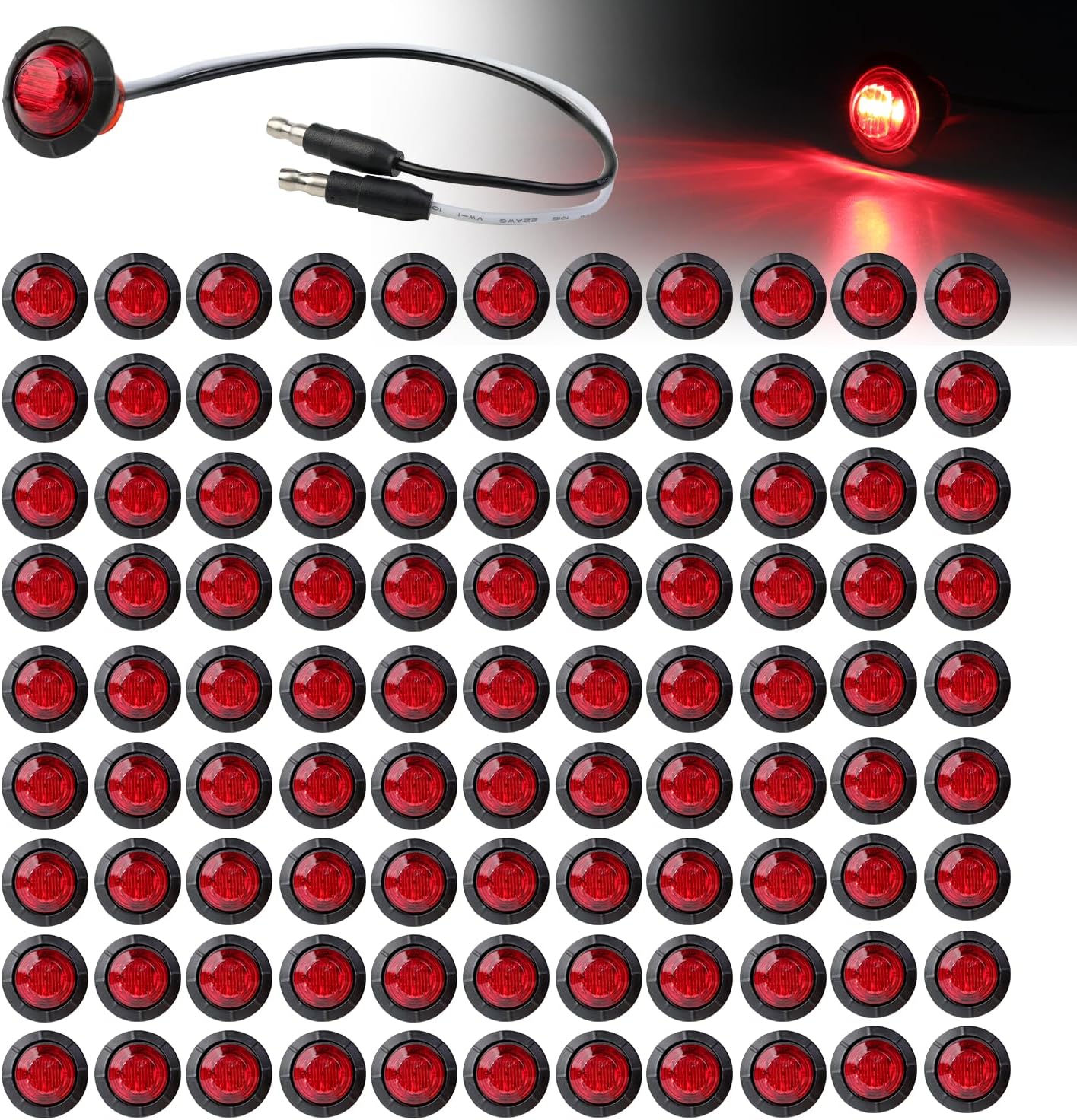 100 Pcs 3/4 Inch Round Side Marker Red Lens & Light Button 3 LED with Connector Plugs for Trailer Truck Lorry SUV ATV RV Bus Clearance Signal Lamps 12V DC