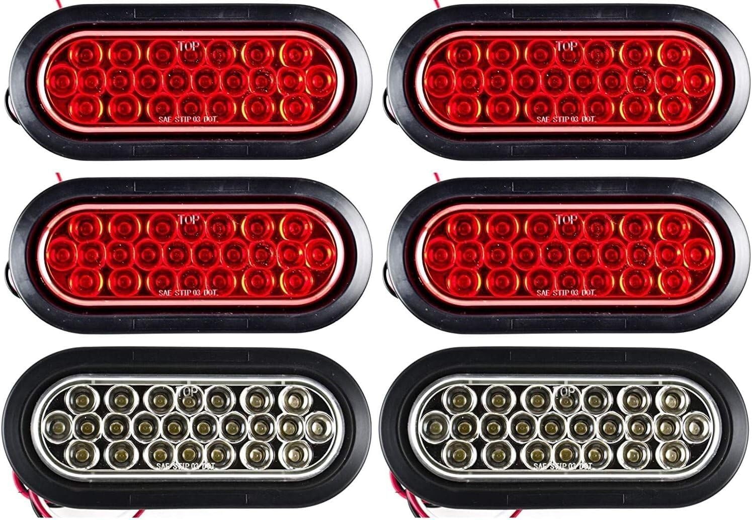 [4 Red + 2 White 6" Oval 24 LED Trailer Stop Turn Tail Reverse Backup Parking Brake Indicator Light Kit DOT Certified With Grommets & Plugs IP67 Waterproof Headache Rack Backrack