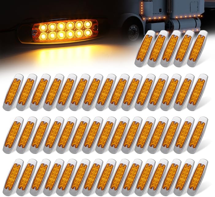 50 Pcs 12V DC 6.4 Inch Amber LED Side Marker Clearance Lamp Heavy Truck Lighting 12 LED Trailer Truck ATV SUV Coach Surface Mount Waterproof (No Connector Plug)