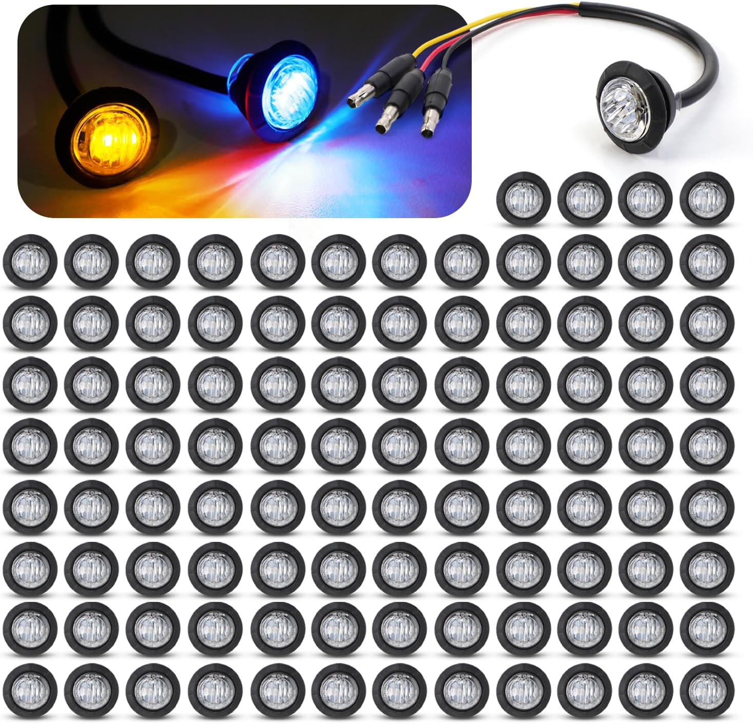MADCATZ 100 Pcs Multi-Color 3/4 Inch Mini Round 2 LED Amber to Blue Side Marker Indicator Clearance Light Dual Colors 12V DC, 3 Wire, for Truck Trailer Boat with Grommet