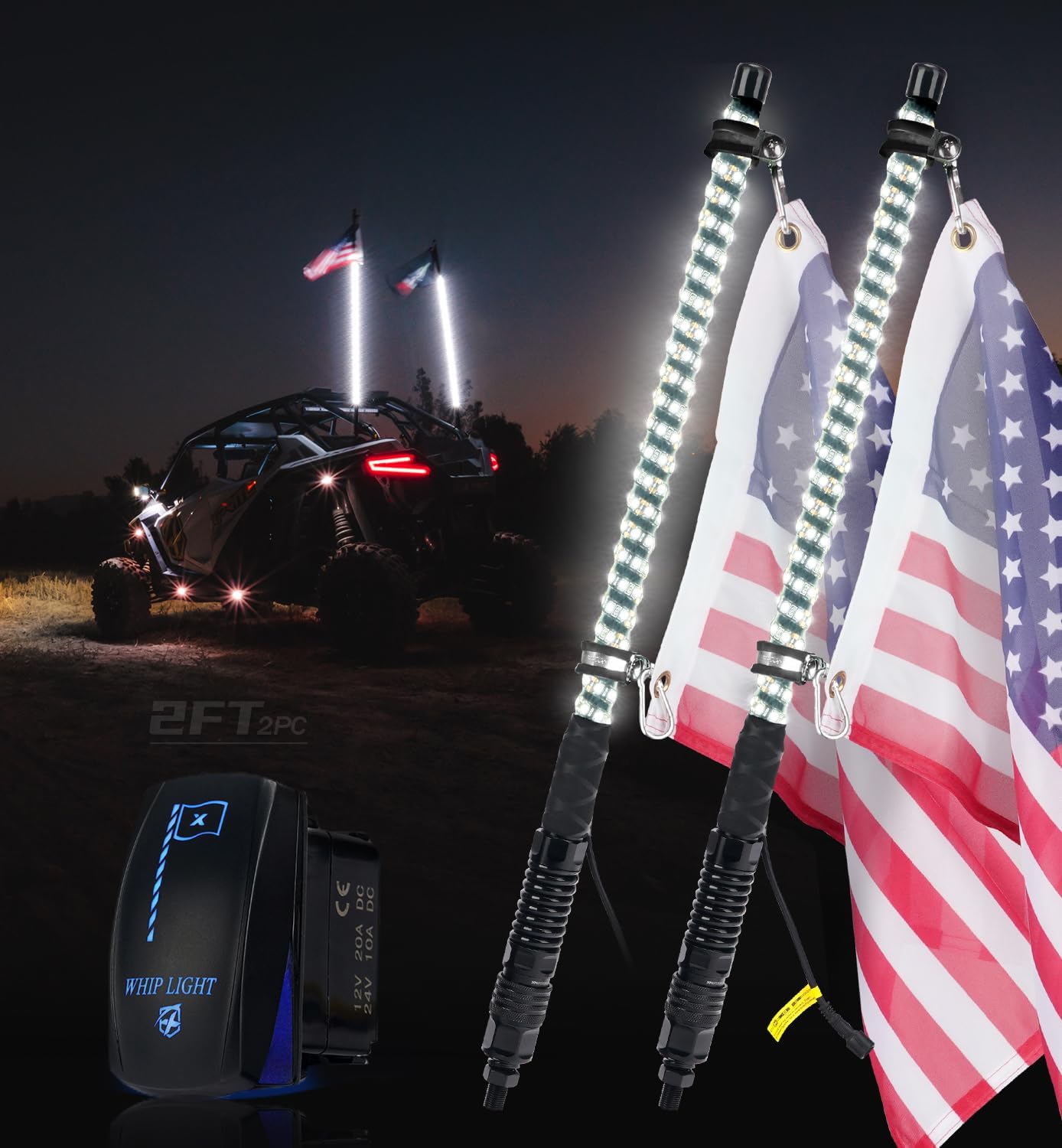Xprite 2PC 2FT White Spiral LED Whip Lights with Built-in Spring Base, Safety Lighted Antenna Whip Pole w/Rocker Switch American Flag, Compatible with SXS ATV UTV Polaris RZR Can-am Trucks Jeep