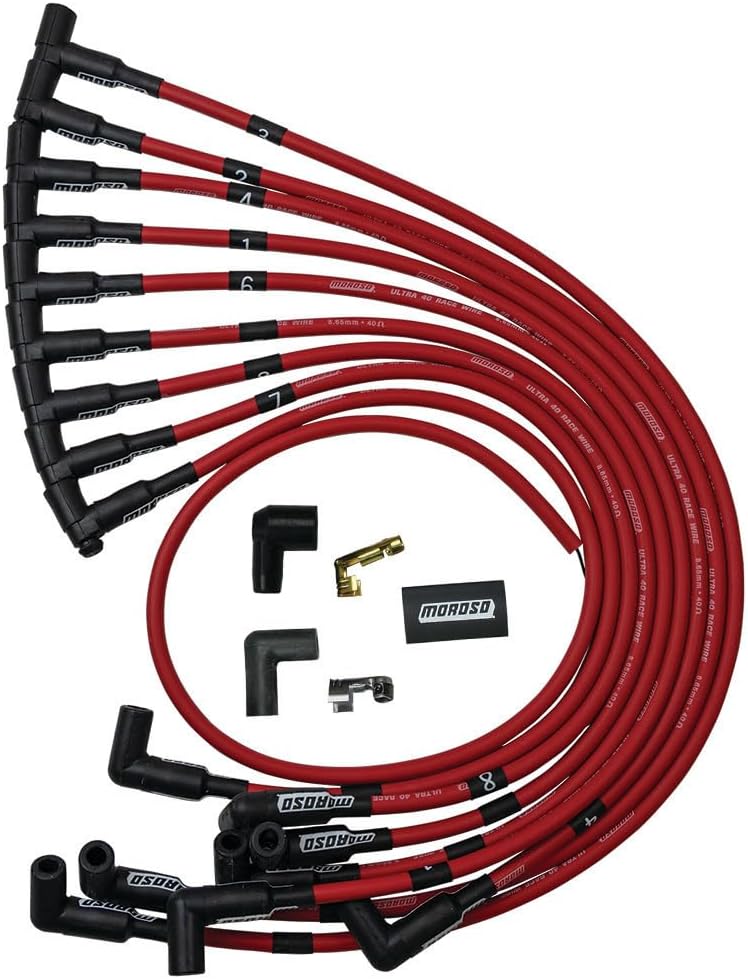 Moroso 73684 Ultra 40 Red Spark Plug Wire Set, 90 Degree Plug Ends, HEI Distributor, Over Valve Cover Routing