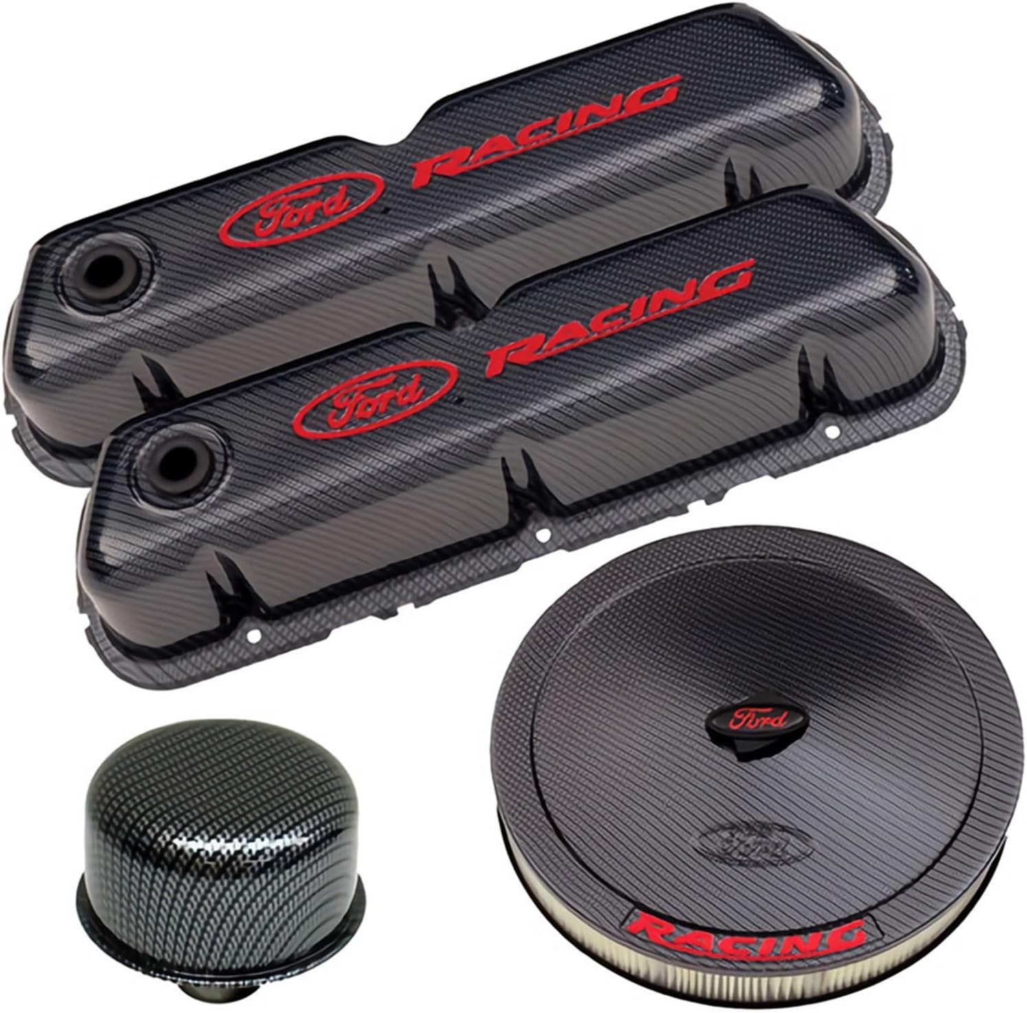 Ford 302-520 Engine Dress Up Kit - Air Cleaner/Tall Valve Covers/Breather Racing Logo - Steel - Carbon Fiber Look - Small Block Kit