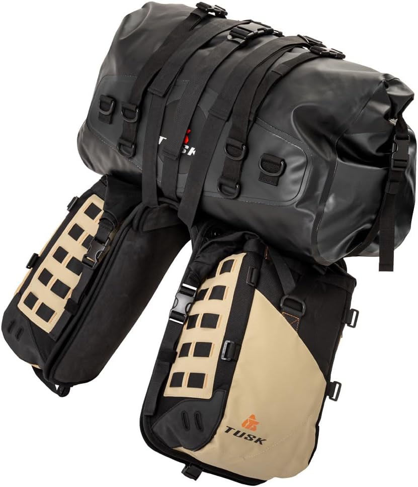 TUSK Highland X2 Rackless Luggage System w/Medium Dry Duffel Tail Bag Standard Heat Shield Black/Tan For Triumph Tiger 900 GT Pro 2021-2025