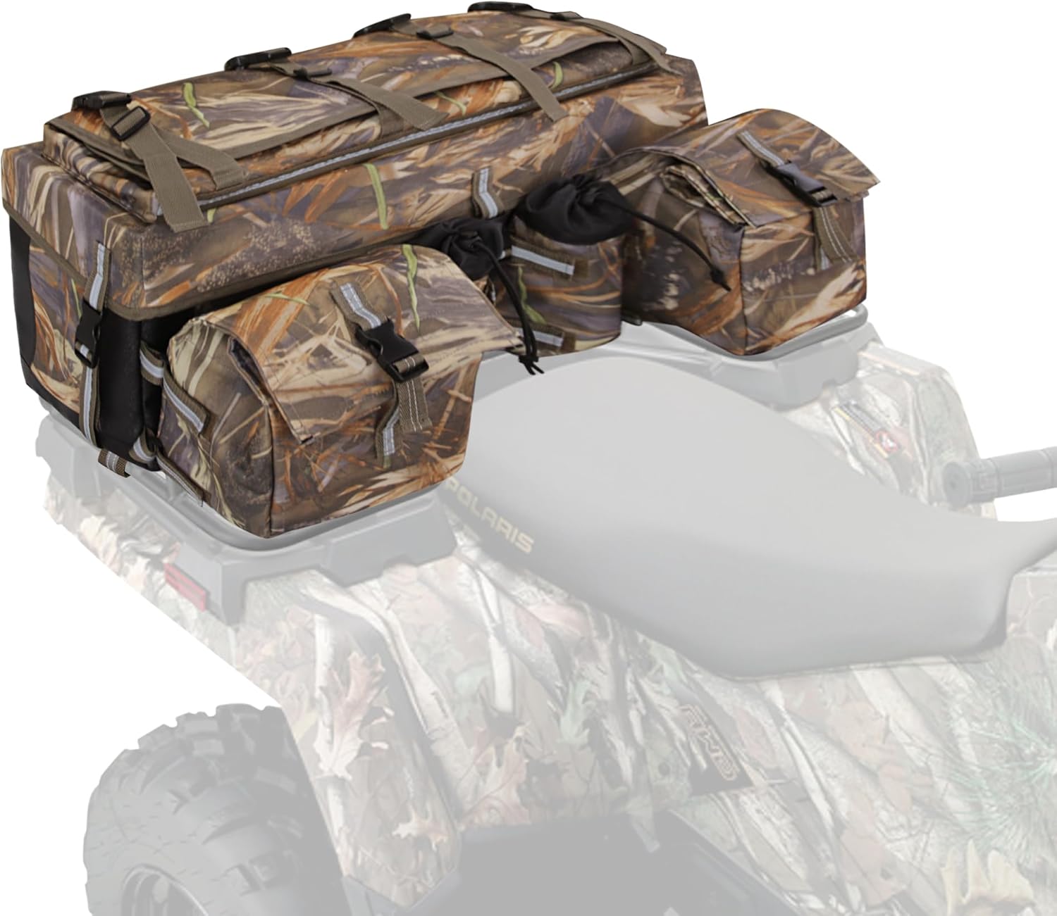 UNISTRENGH ATV Cargo Bag Rear Rack Gear Bag 600D Waterproof Oxford with Reflective Stripe Topside Bungee Tie-Down Storage Padded-Bottom Multi-compartment Camo All Purpose Rear Seat Bag (Camouflage #2)