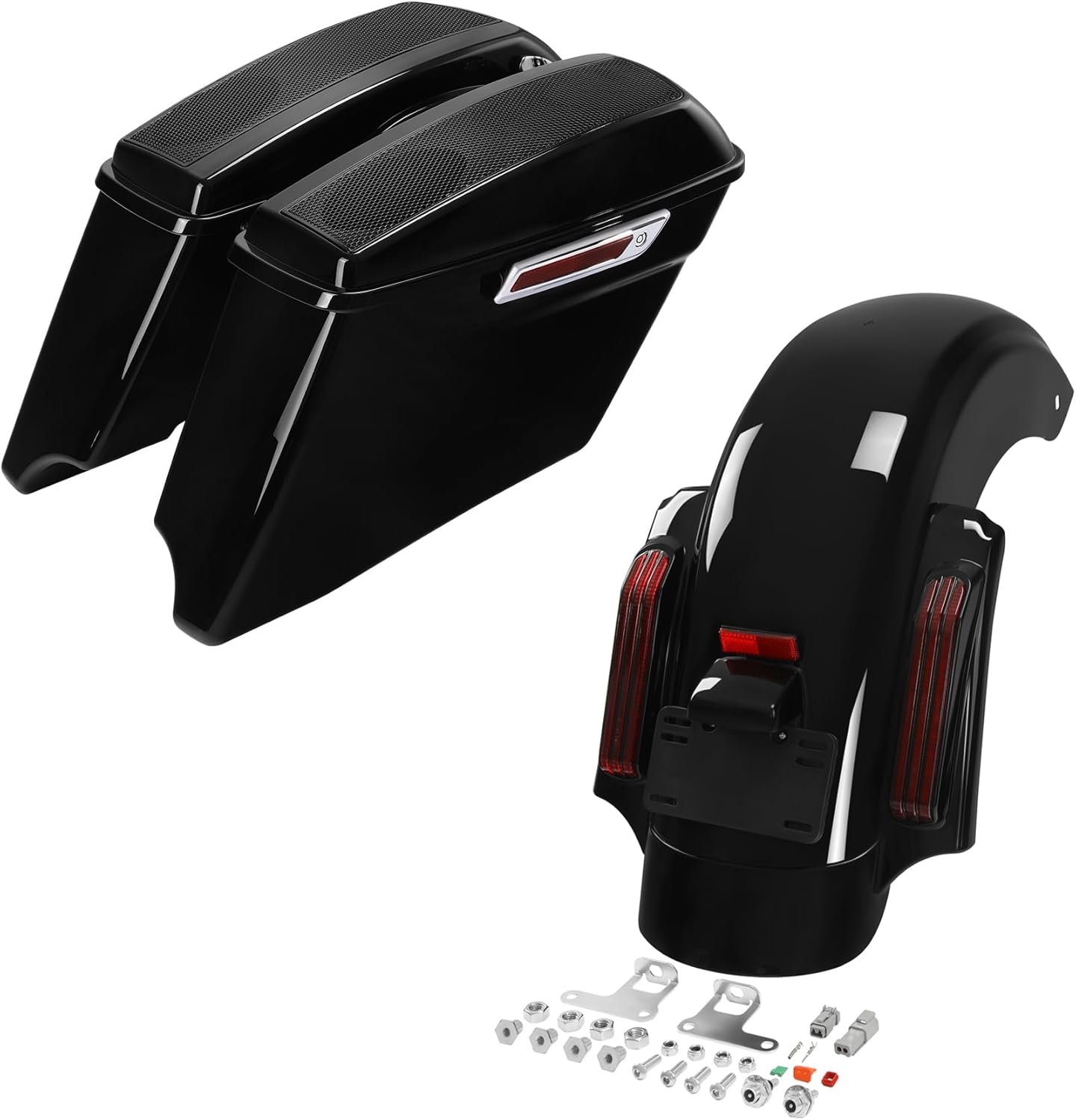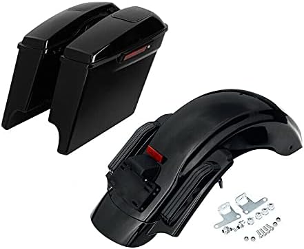 XMT-MOTO 4" Extended Stretched Hard Saddlebags w/5x7 Dual Speaker Lids + Rear Red Lens Fender Kit with Integrated LED Stop/Tail/Turn Signal Lights Fit For Harley Touring 2014-Later Vivid Black