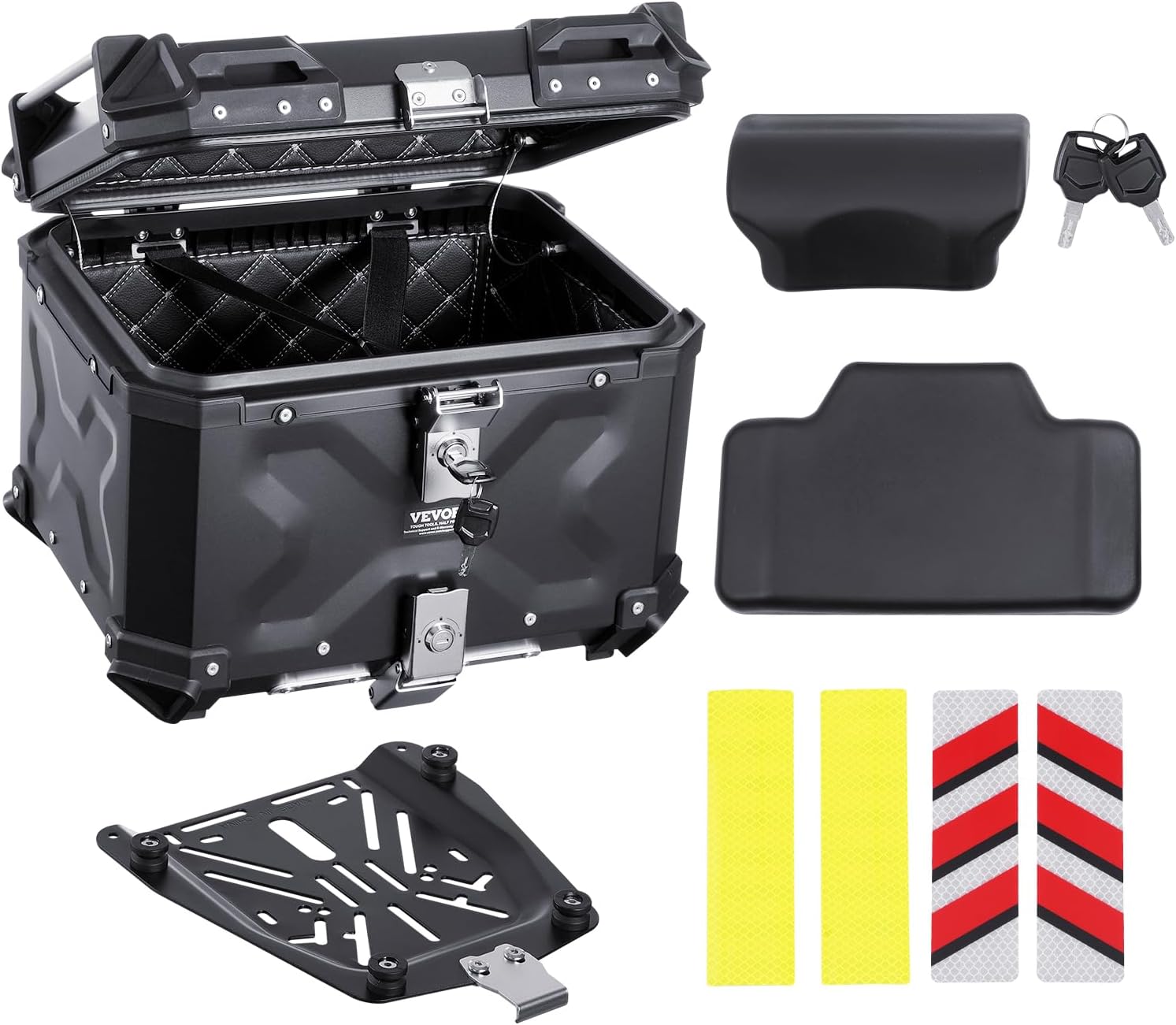 VEVOR Motorcycle Top Case 45L, Universal Aluminum Alloy Motorbike Tail Box with Leather Lining, 45L Waterproof Detachable Motorcycle Top Box with Lock & Back Cushion, Fit for 99% of Motorcycle Frames