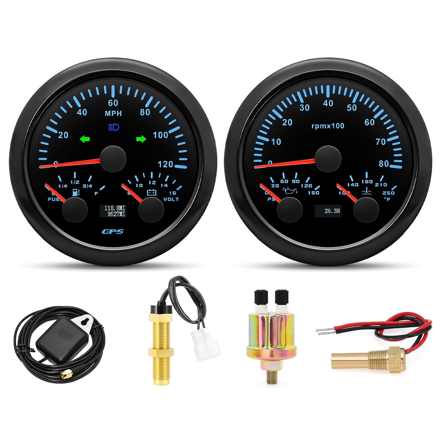 ARTILAURA 3in1 GPS Speedometer& Fuel Gauge (Adjust 240-33ohms, 0-90ohms, 0-190ohms, 10-180ohms) &Voltmeter+ 3in1 Tachometer& Oil Pressure Gauge & Water Teperature, 7 Color for Marine Car Auto