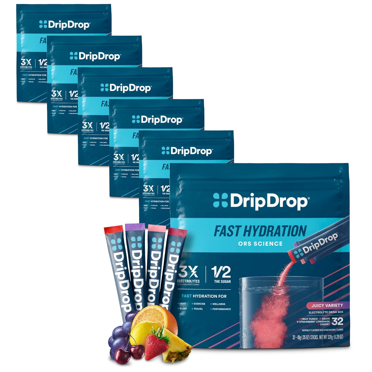 DripDrop Hydration Packets - Juicy Variety Pack - Single Serve Electrolytes Powder Drink Mix - Grape, Fruit Punch, Strawberry Lemonade, Cherry - Non-GMO, Gluten Free, Vegan - 192 Sticks