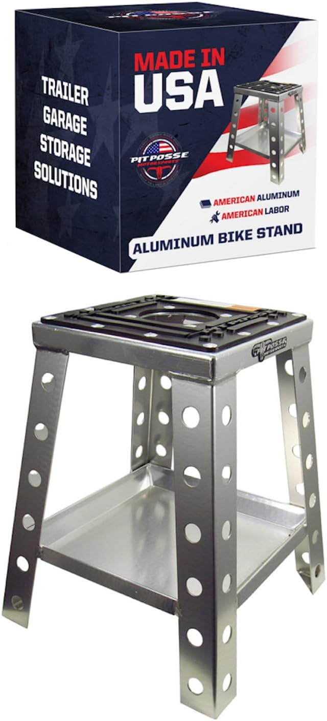Pit Posse Aluminum Motorcycle Dirt Bike Stand w/Tool Tray (17") Made in USA - Universal Powersports Jack Lift (350lb Max) Compatible with Yamaha Honda Kawasaki Suzuki and Most Off-Road Bikes (Silver)