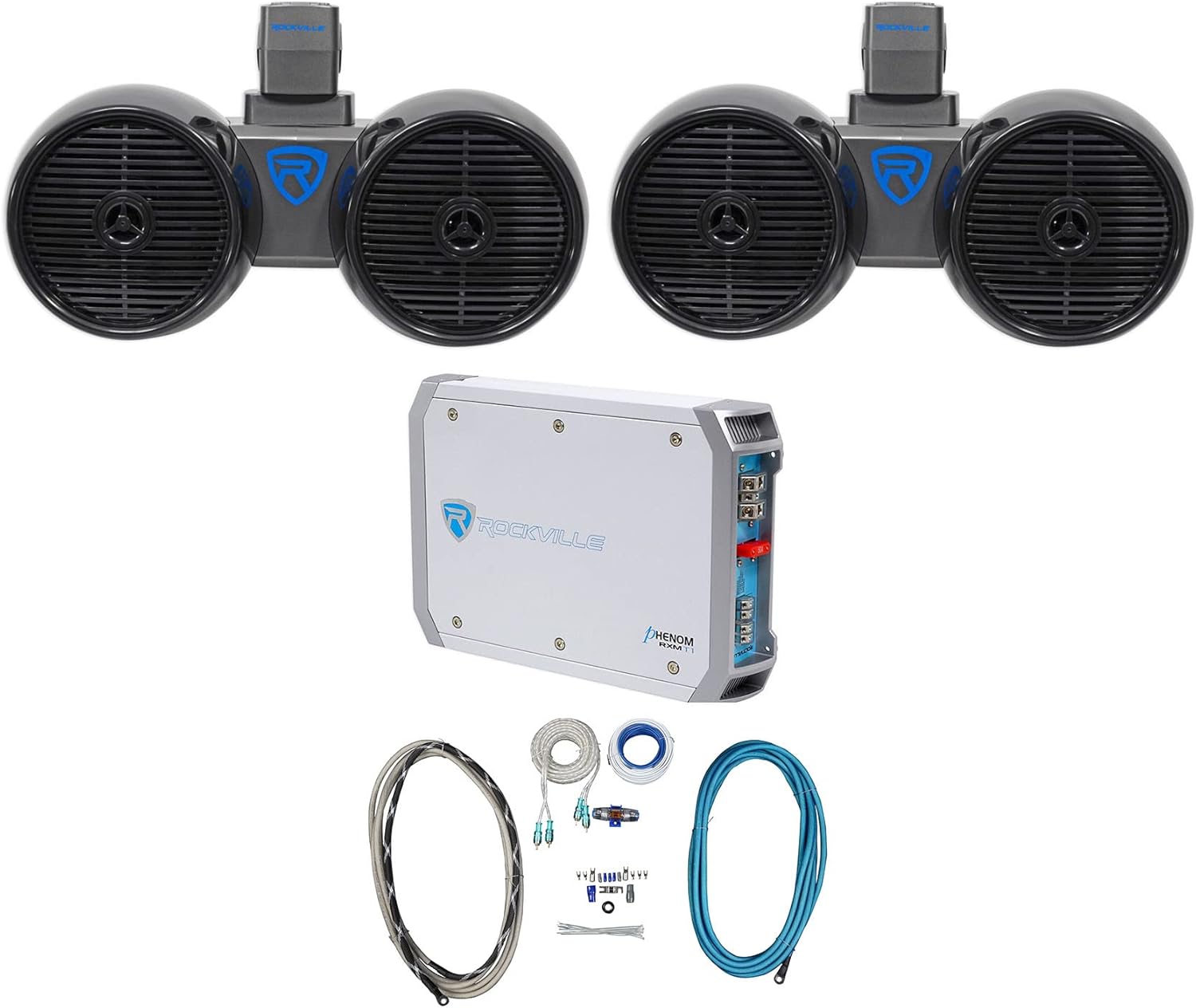 Rockville Bundle: (2) DWB65B Dual 6.5" Marine Tower Speaker System Bundle RMWK4 AWG Marine Amplifier & RXM-T1 Peak Marine 2 Ch Amplifier (4 Items)