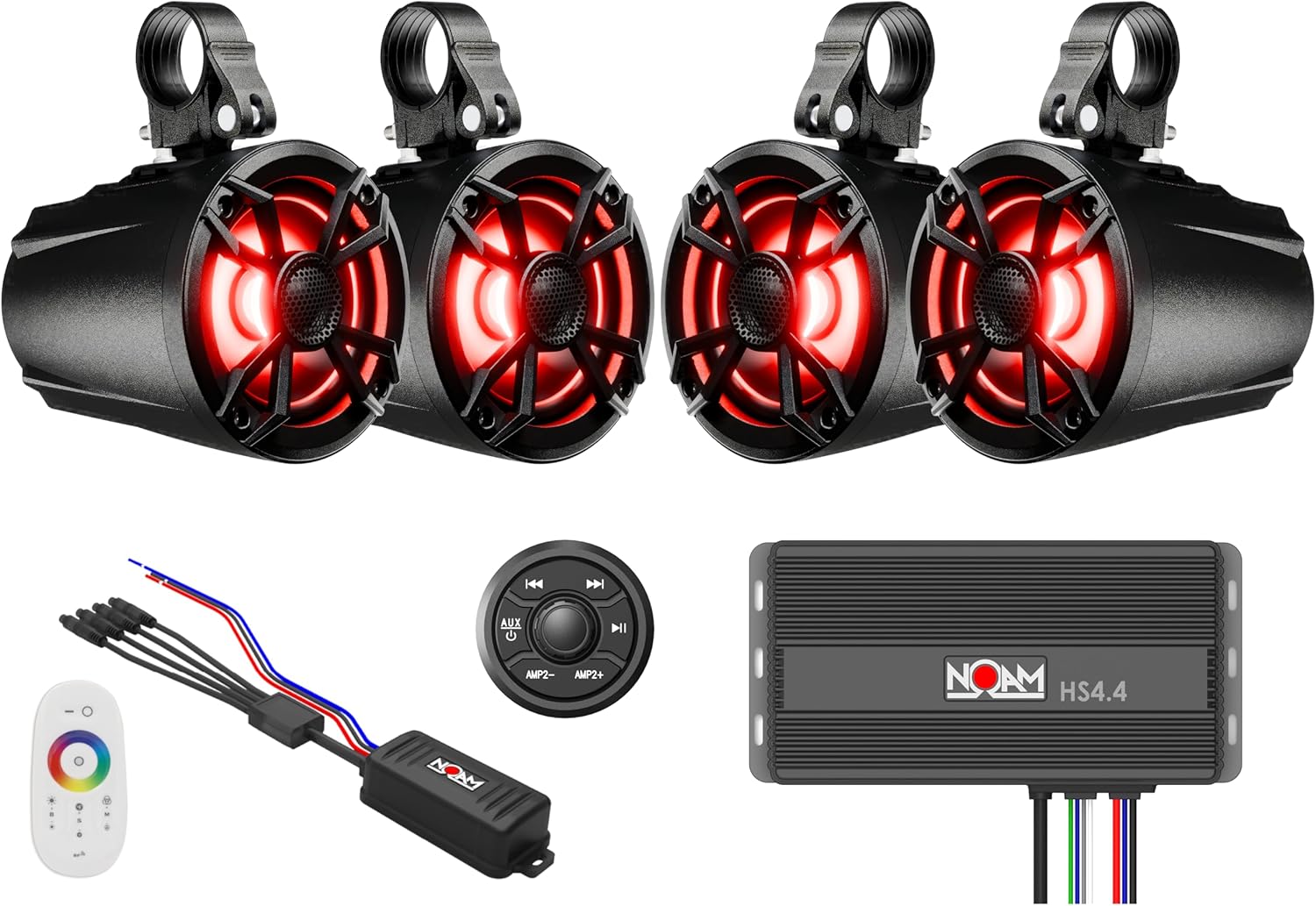 NOAM NUTV5 Quad - Marine ATV/Golf Cart/UTV Stereo System kit – with 4 Waterproof LED Light Tower Speakers, Weatherproof Controller/Head Unit with Bluetooth and AUX Input and Four Channels Amplifier