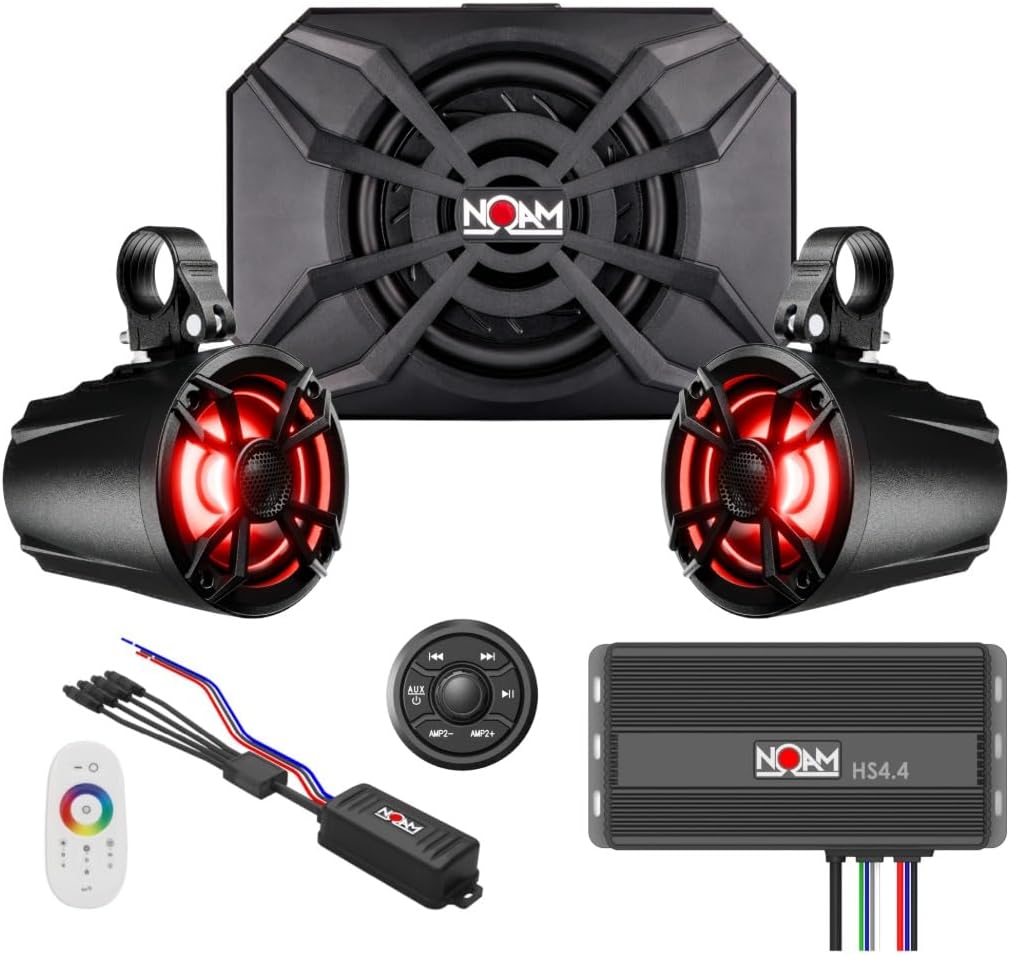 NOAM NUTV5-S V.2 - Marine ATV/Golf Cart/UTV Stereo System kit – with 2 Waterproof LED Light Tower Speakers, Subwoofer, Weatherproof Controller with Bluetooth and AUX Input and Four Channels Amplifier