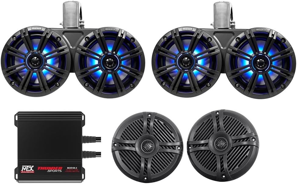 Audiosavings Bundle: Pair Kicker 45KMTDC65 Dual 6.5" 390w Marine Wakeboard Tower LED Speakers Bundle with Pair Rockville 6.5" 800w Marine Boat Speakers Black & 400W RMS 4-Ch Amplifier (3 Items)