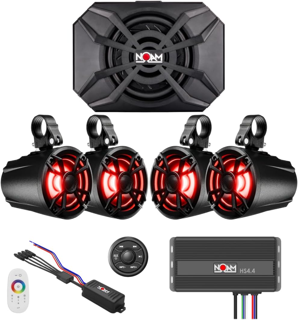 NOAM NUTV5-S QUAD - Marine ATV/Golf Cart/UTV Stereo System kit – with 4 Waterproof LED Light Tower Speakers, Subwoofer, Weatherproof Controller with Bluetooth and AUX Input and Four Channels Amplifier