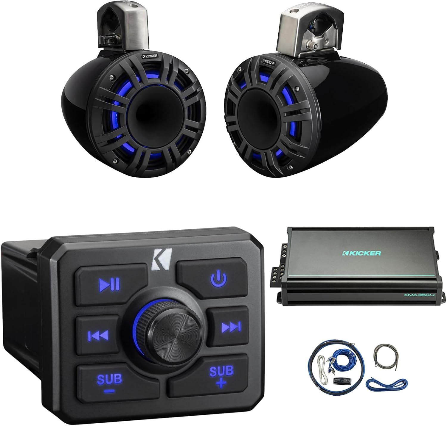 KICKER 51KBTR Marine Bluetooth Powersport USB/AUX Sub RCA Outputs Receiver, 2X 8 500W Max Power Tower LED System Speakers, 4-Channel 90 Watts x 4 Weather-Resistant Full-Range Amplifier W/Kit