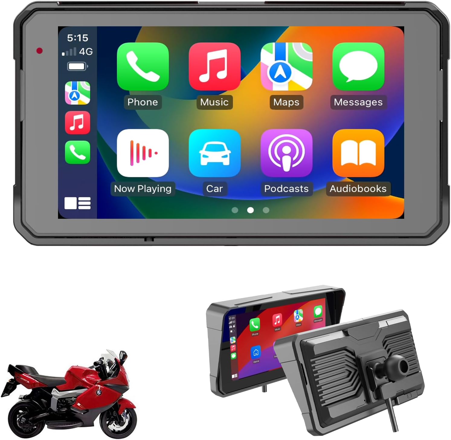 Portable Motorcycle CarPlay Motorcycle with Apple CarPlay and Android Auto, 5-inch Touchscreen, Dual AHD Cameras, Siri and Google Assistant, Loop Recording/BSD/Dual Bluetooth/GPS.