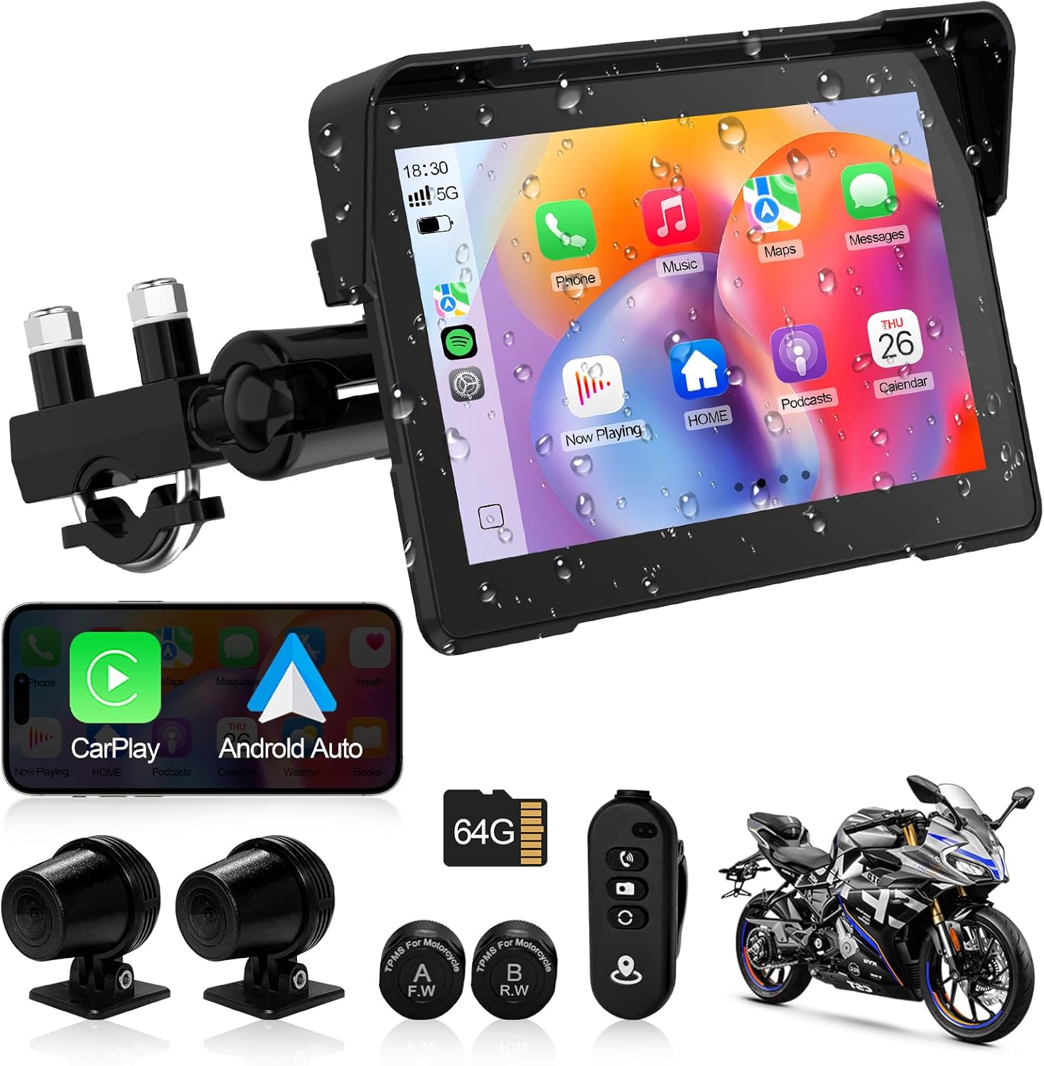Artman Motorcycle Dash cam Front and Rear, 7'' IPS Touch Screen, Portable Motorcycle Carplay for Apple Carplay and Android Auto GPS Navigation System, TPMS Compatible, IP67 Waterproof & 64G SD Card