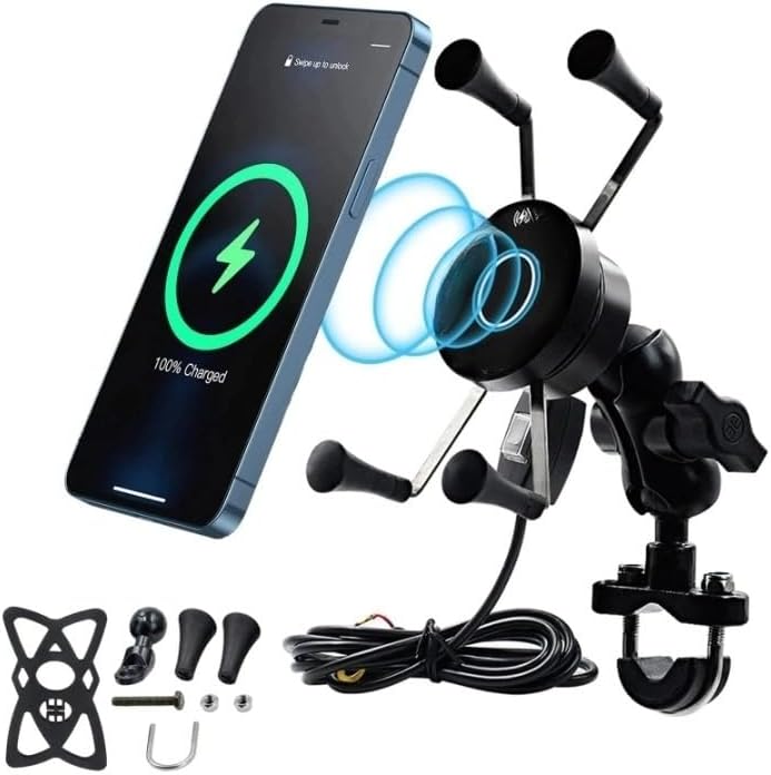 15W Fast Wireless Charging Adapter for Motorcycle - Qi-Compatible Phone Holder with 4 Jaw Locking Mechanism and 360° Rotation