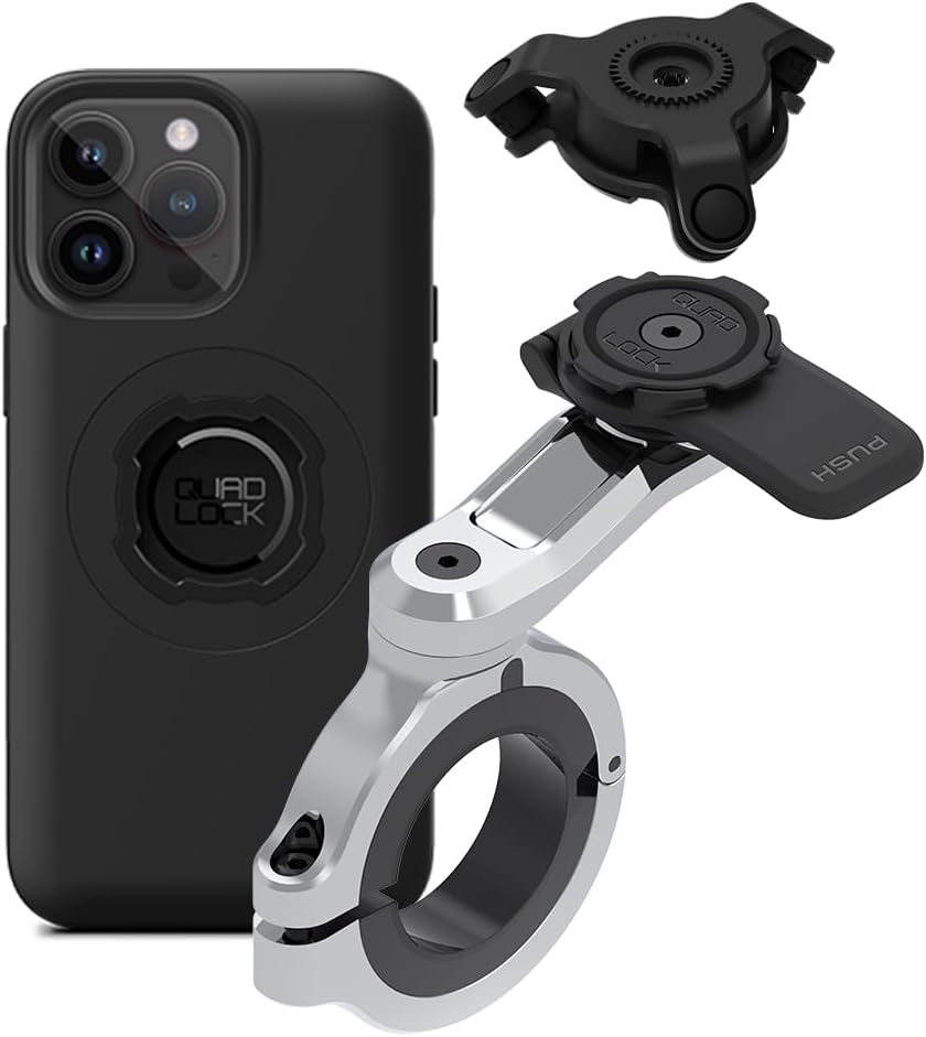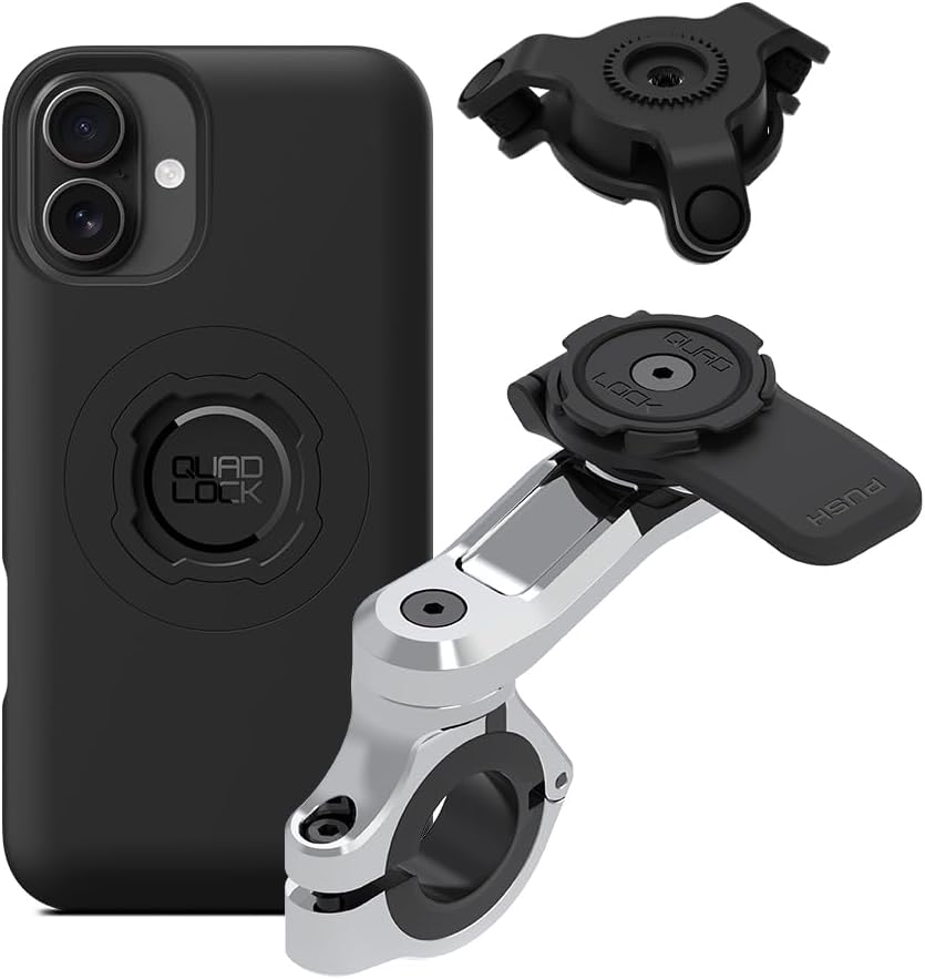 Quad Lock Motorcycle Handlebar Phone Mount PRO Chrome with Vibration Dampener and MAG Phone Case for iPhone 16 Plus
