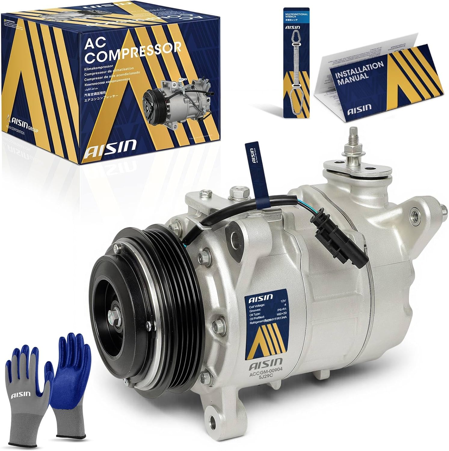 AISIN ACCGM-00904 Air Conditioner AC Compressor - Compatible with Chevrolet Silverado GMC Sierra 1500 2019-2023, Silverado Sierra 2500 3500 HD 2020-2023 - with 4-Pulley Groove, with Clutch