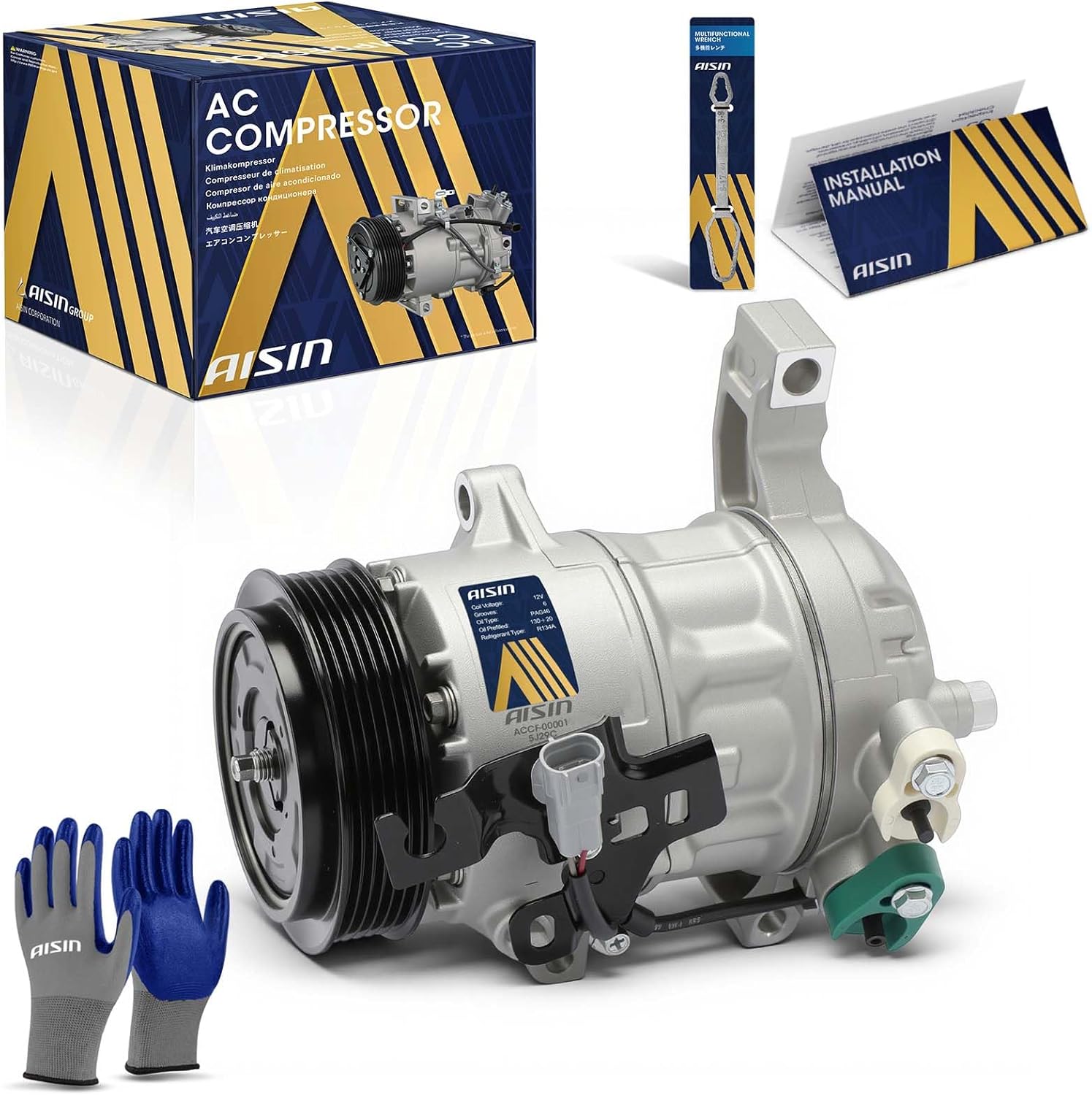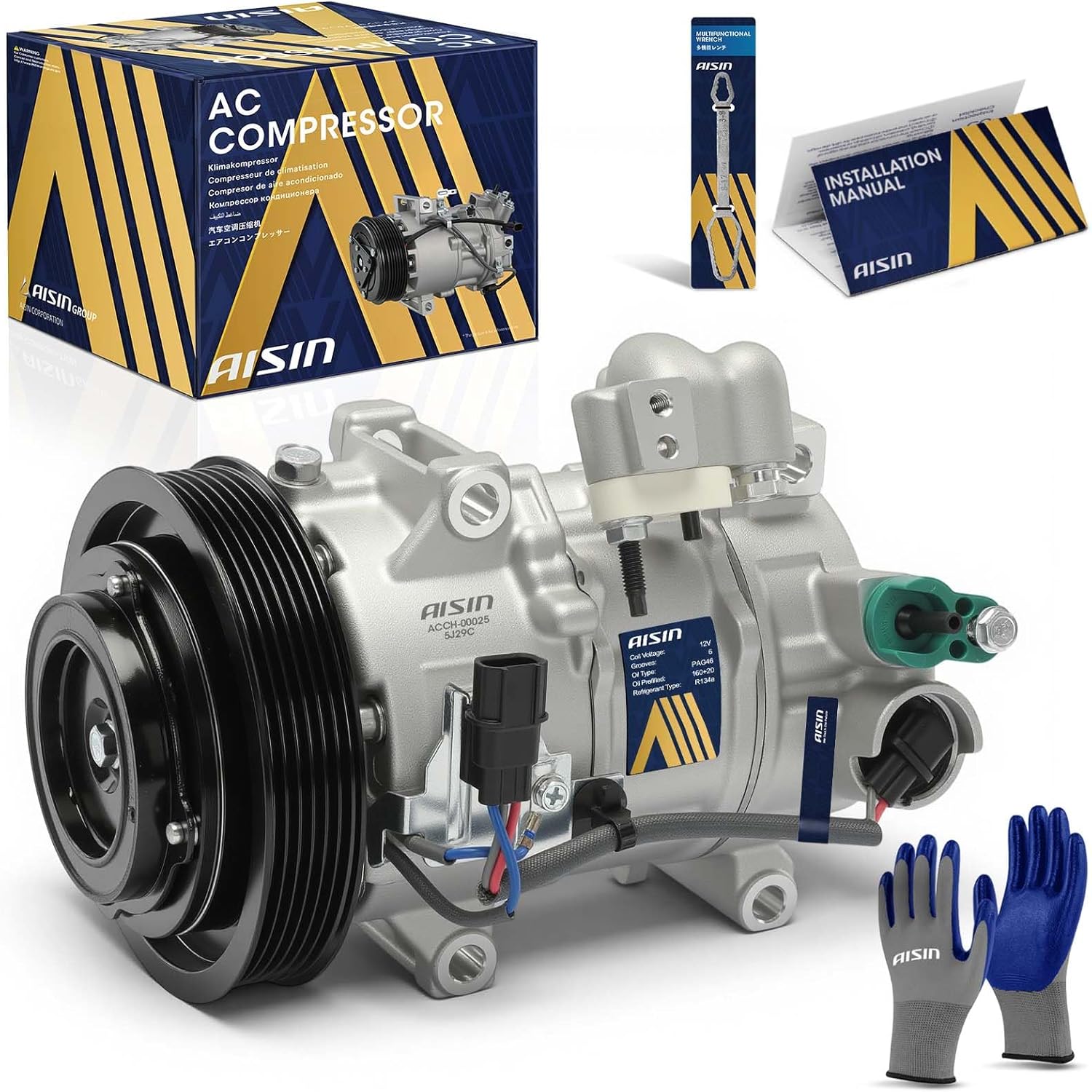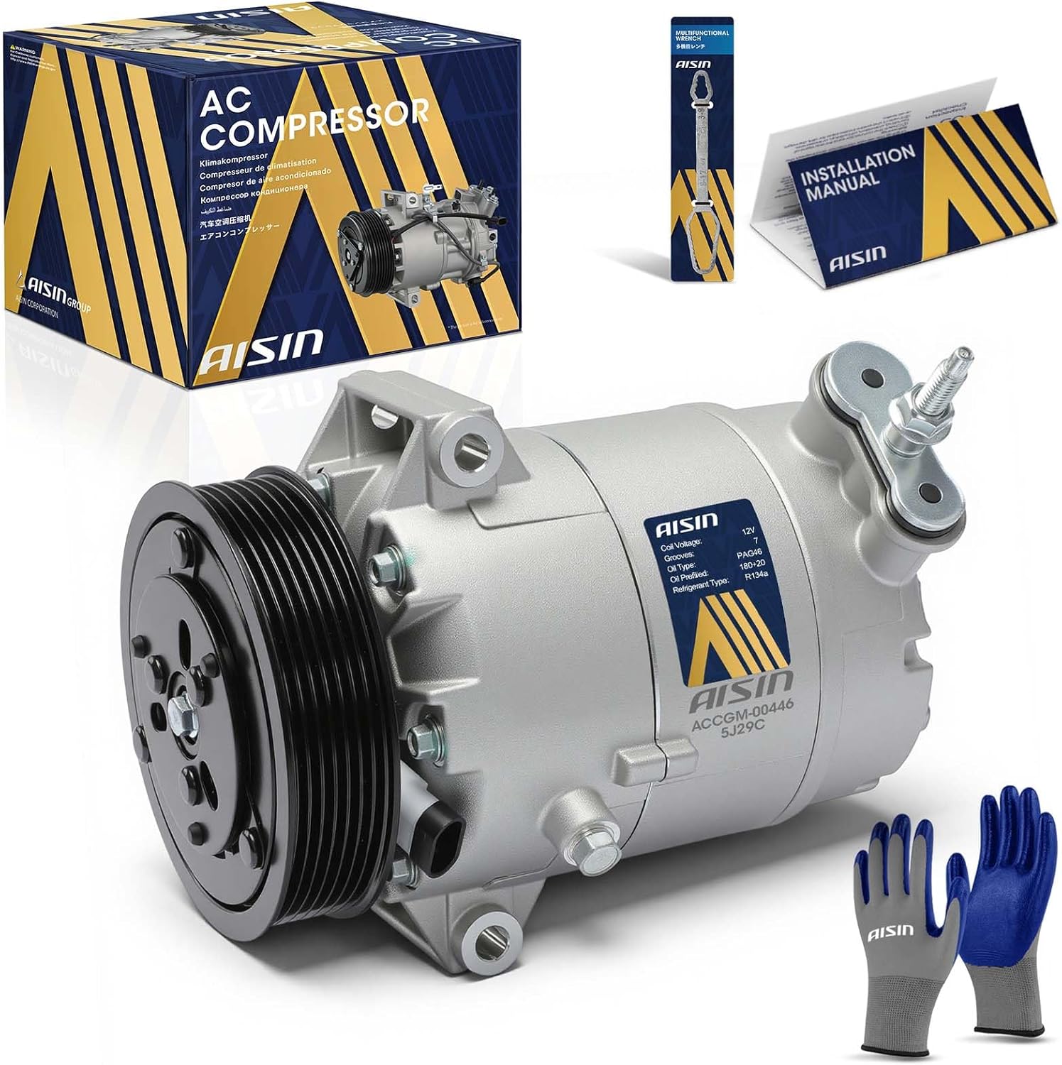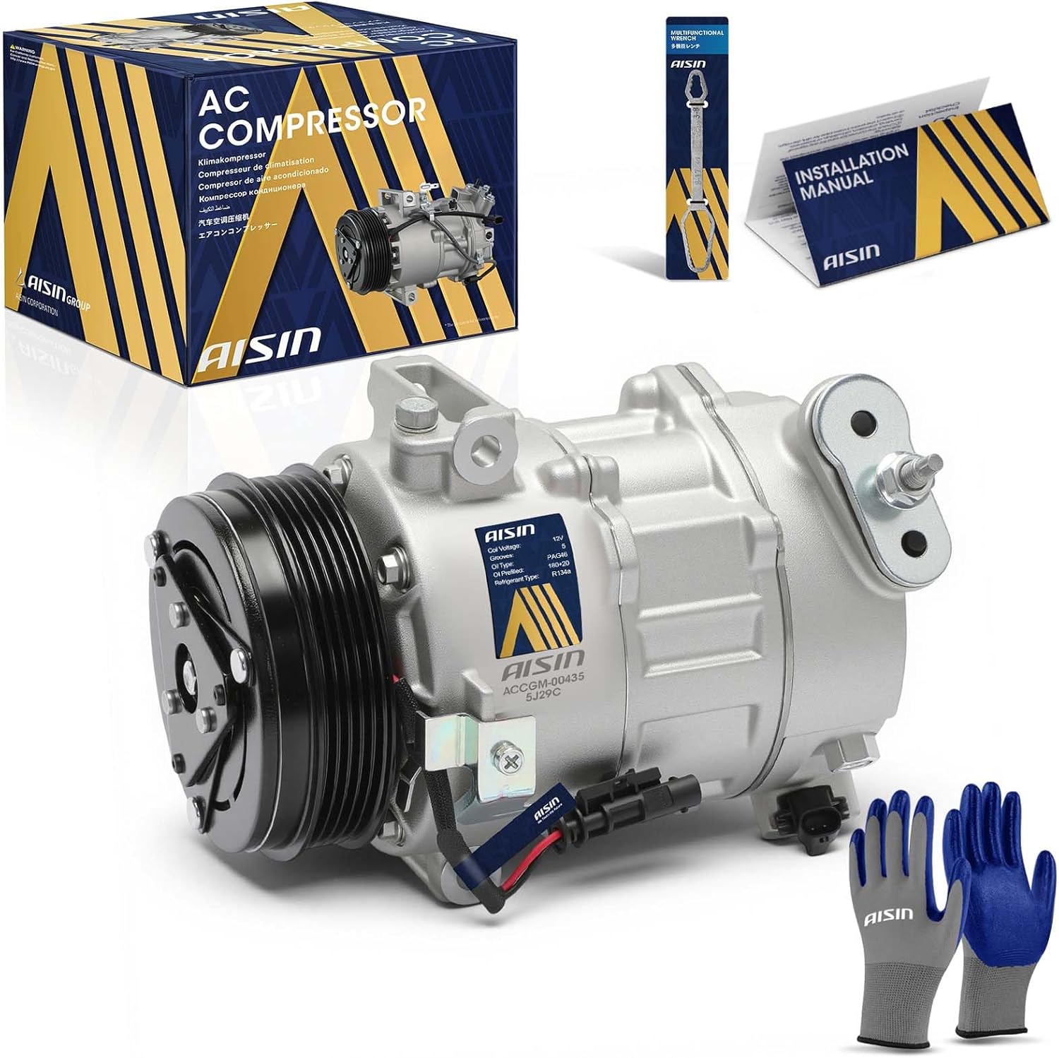 AISIN ACCGM-00435 Air Conditioner AC Compressor - Compatible with Chevrolet Silverado 1500 2019-2024, Silverado 1500 LTD 2022, GMC Sierra 1500 2019-2024 - 2.7L - with 5-Pulley Groove, with Clutch