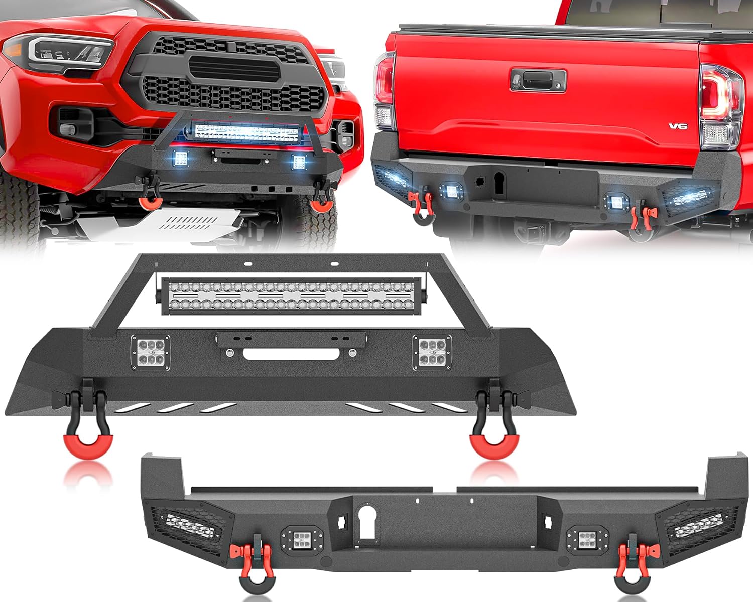 for Tacoma Stubby Front Bumper and Rear Bumper Compatible with 2016-2023 Toyota Tacoma 3rd Gen with Winch Plate, Sensor Holes, 7 x LED Lights, License Plate Frame, Mesh Paintable Armor & D-rings
