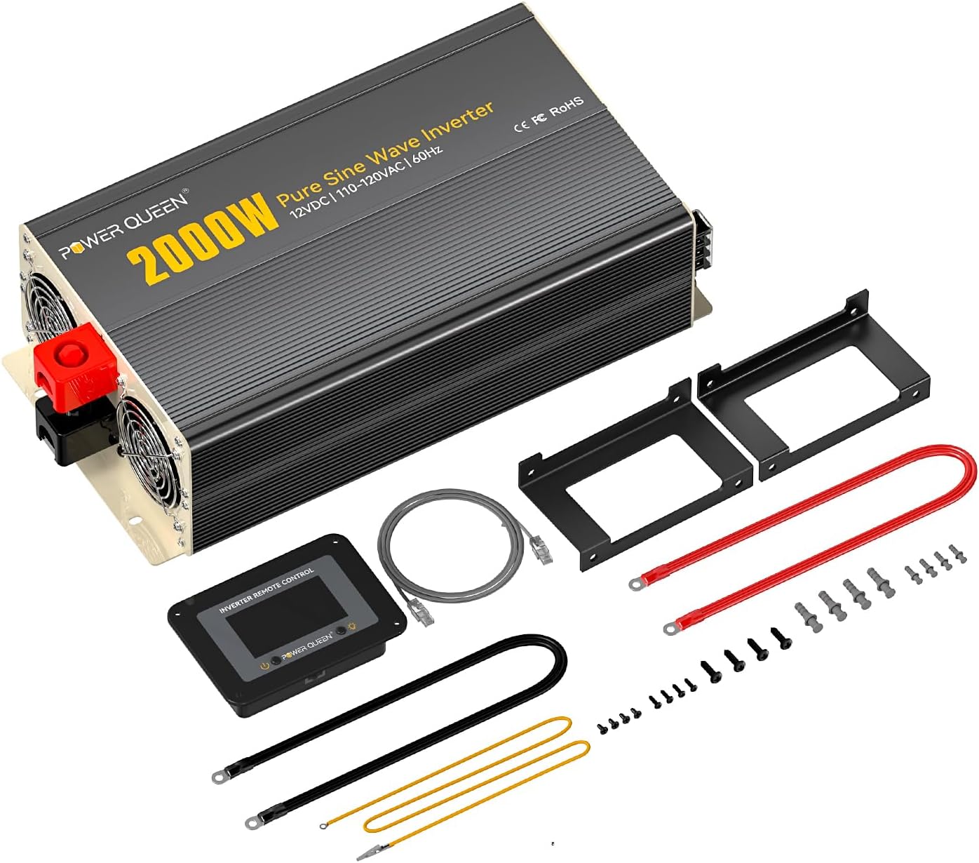 Power Queen 2000W Pure Sine Wave Inverter, Solar Power Inverter 12V DC to 110V-120V AC Converter with 2 AC Outlets, LCD Display for Off-Grid Solar Power System, RV, Truck, Home Appliances