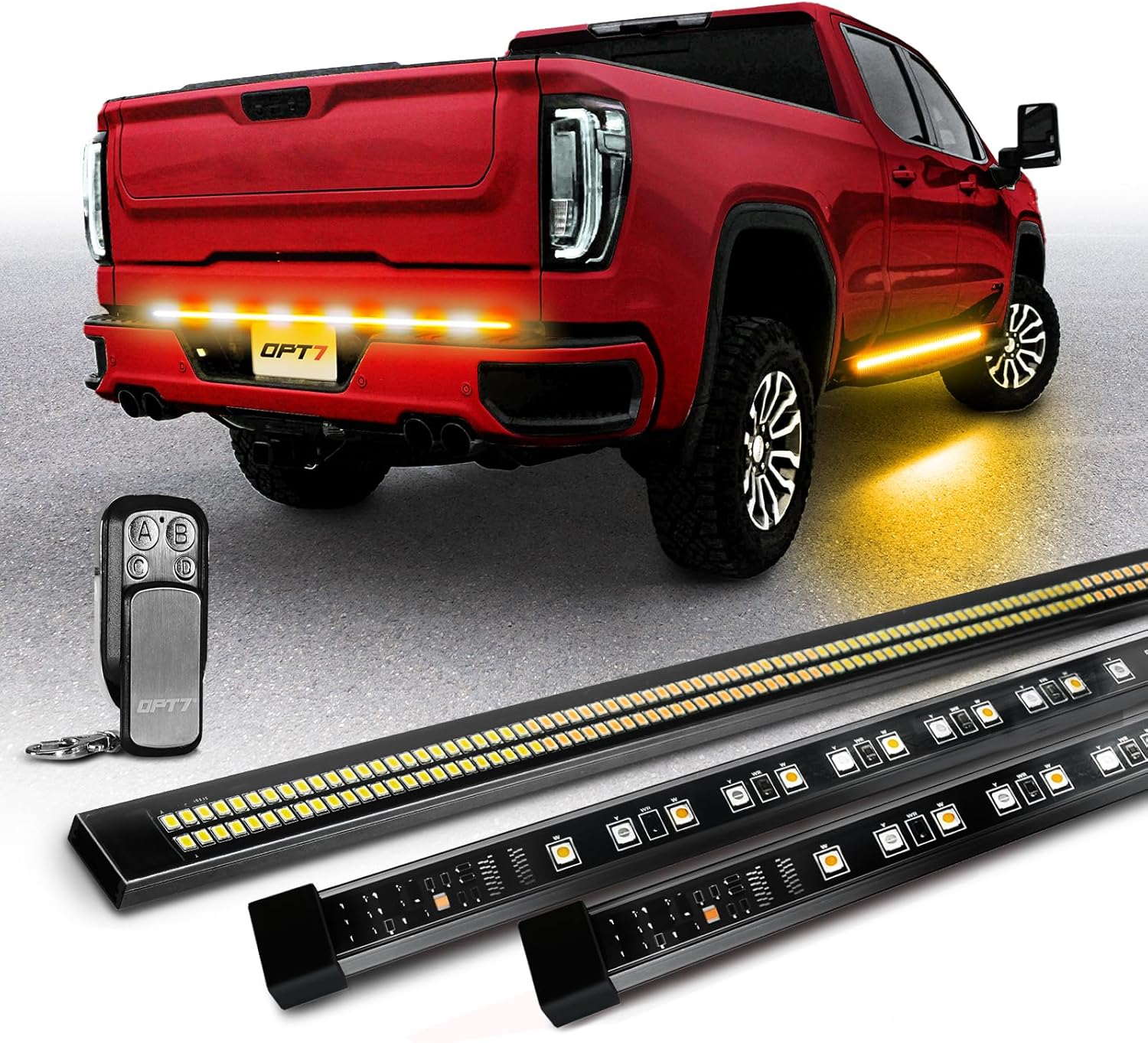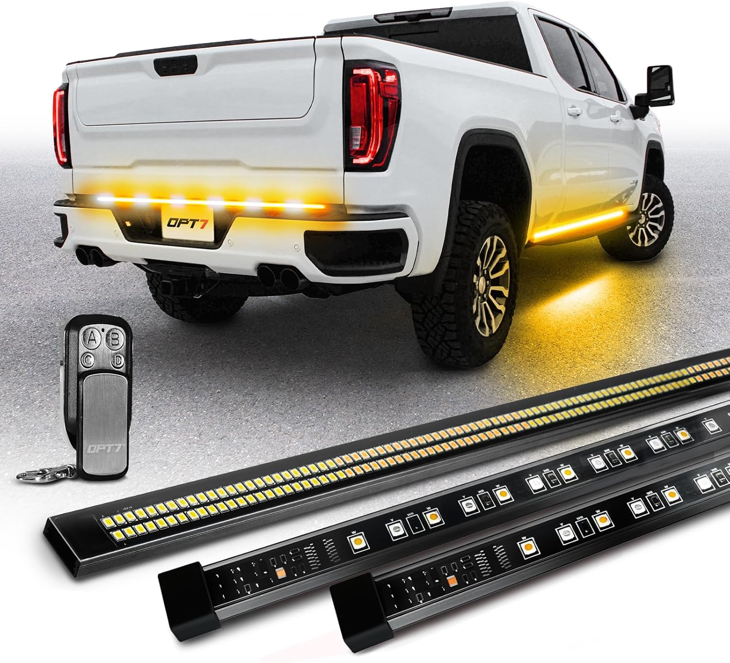 OPT7 Sidekick 86" Running Board Lights 2PCS Strips with Sequential Amber Turn Signal & 60" Tailgate LED Strobe Ligt Bar Double Row