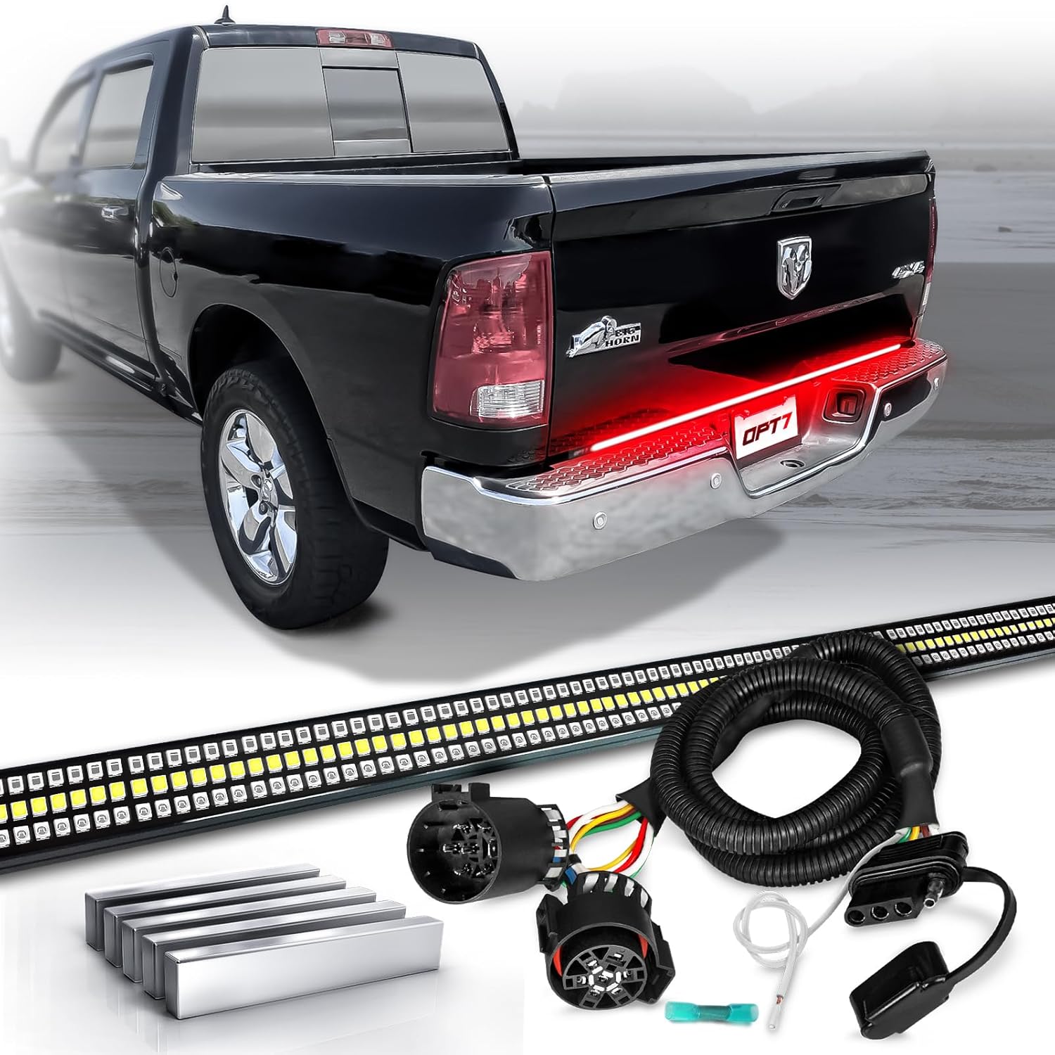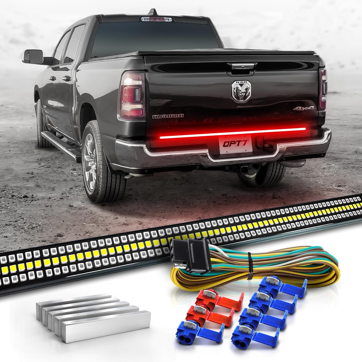 OPT7 Bundle for 2015-2025 RAM 1500/2500/3500 – 60" Redline Triple Row LED Tailgate Light Bar w/Sequential Red Turn + Hardwire Kit + 10pcs Easy-Install Neodymium Magnets