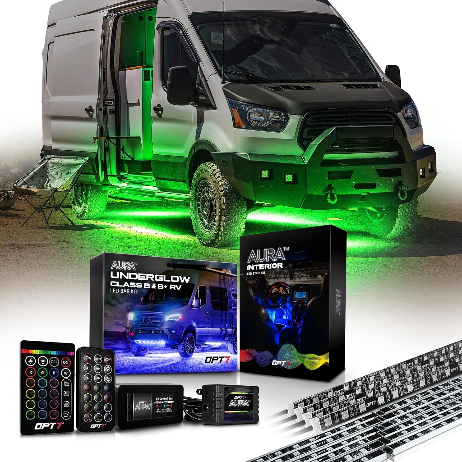 OPT7 Interior Bundle w/Underglow LED Light Kit Remote Controlled, Music Sound Sync Lighting, Outdoor Decorative Lights, Camper Van Must Haves, Exterior Neon Accent RV Essentials