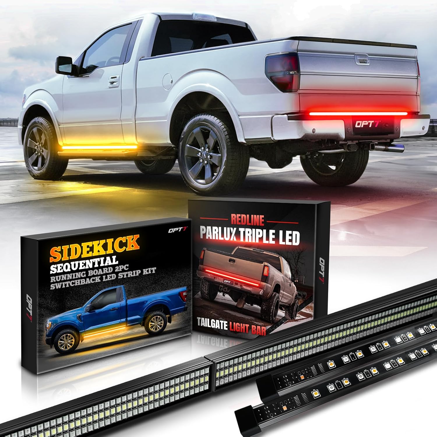OPT7 60'' Redline Parlux Triple Row LED Tailgate Light Bar w/Sequential Red Turn & 2pc 60" Sidekick Running Board LED Strips w/SEQUENTIAL Amber Turn