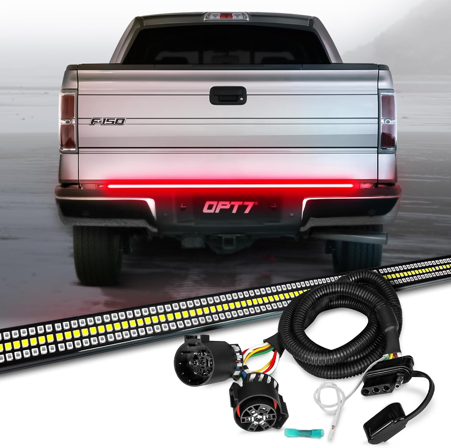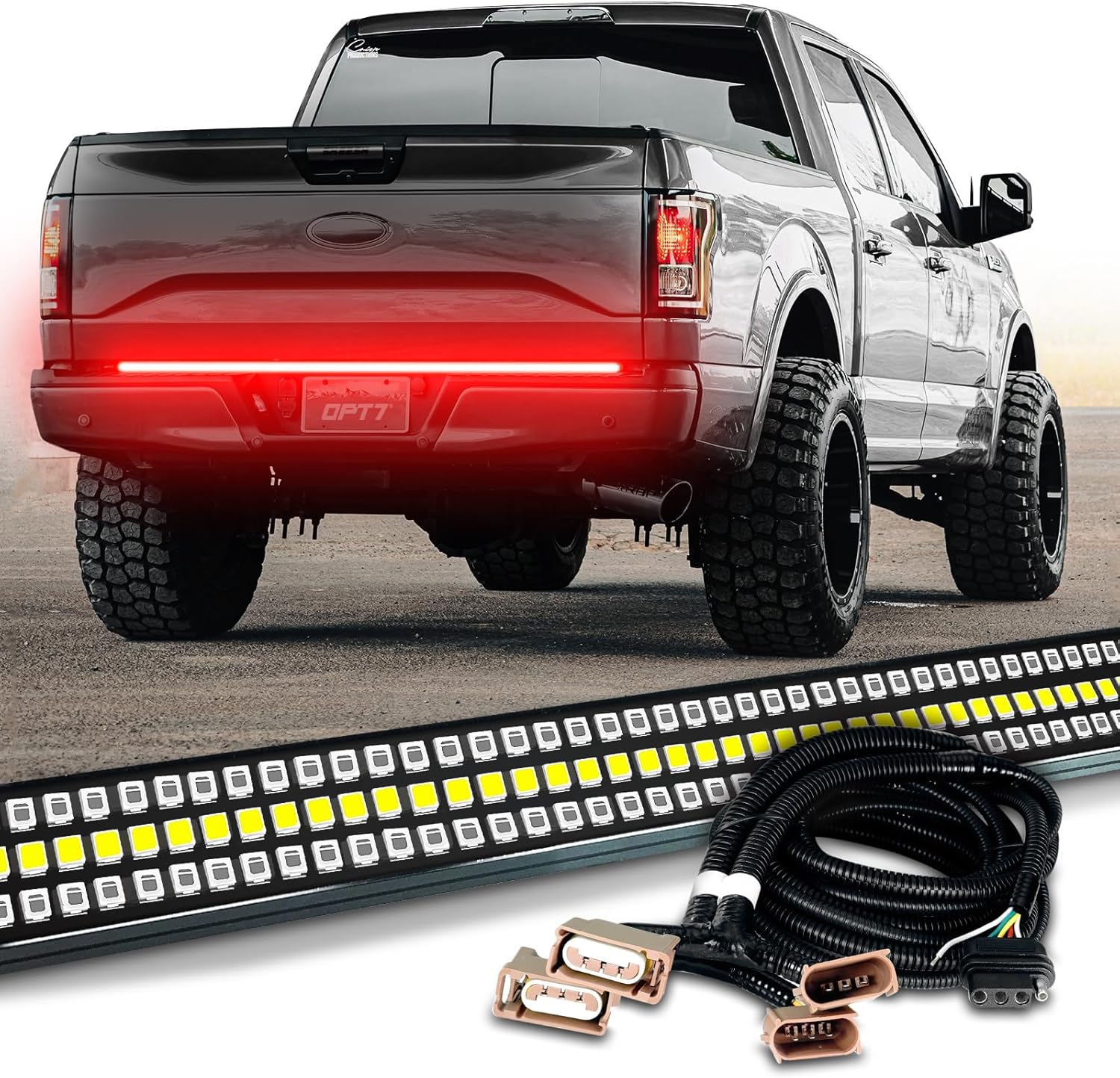 OPT7 Plug'n'Play Bundle for 2015-2018 F150 Without Blind Spot Monitor – 60" Redline Triple Tailgate Light Bar w/Sequential Amber Turn + Easy Connect Harness