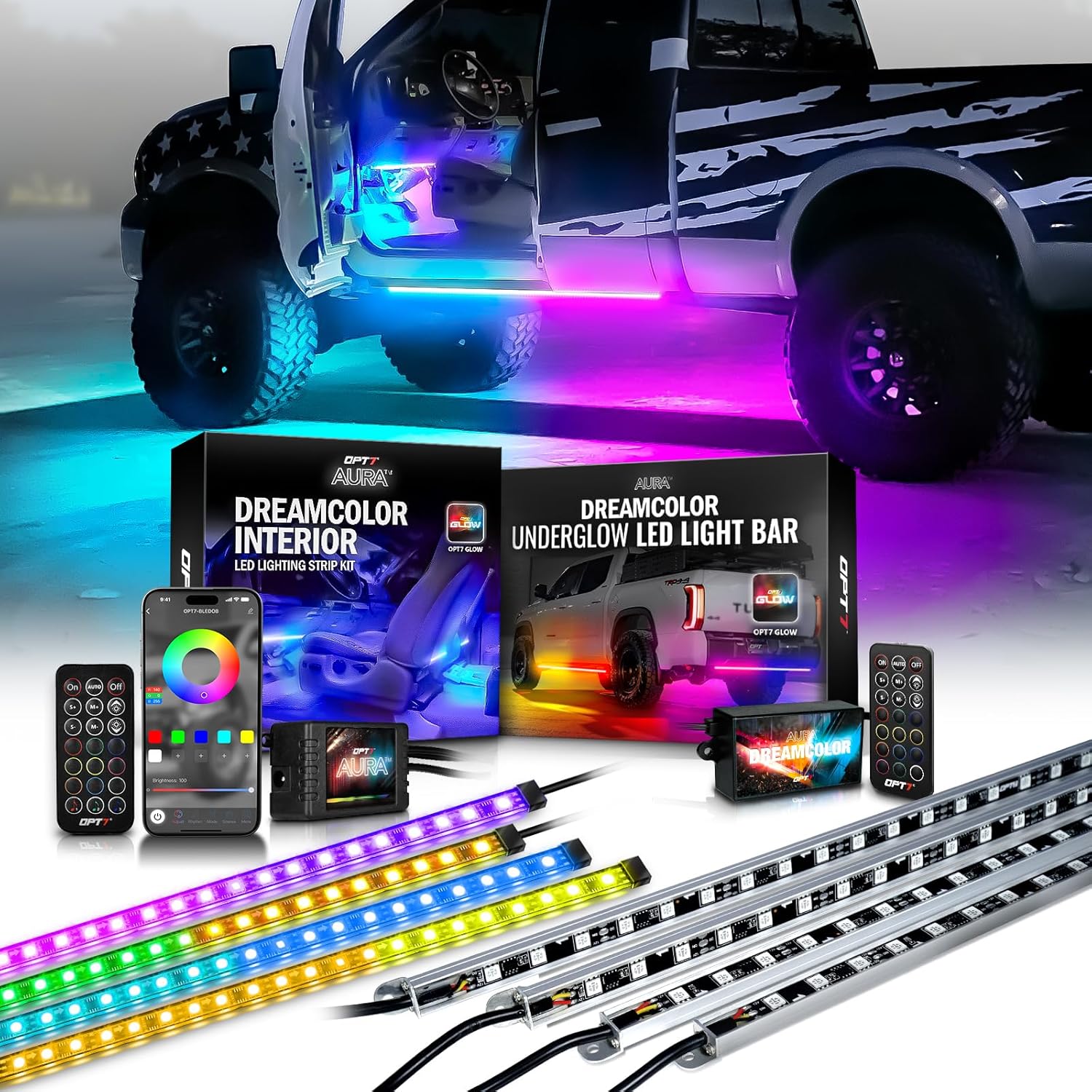 OPT7 Interior & Underglow Dream Color Bundle Kit with APP & Remote Control, 4PCS Rigid Light Bar, 4PCS Flexible Light Strips, Trucks Exterior Neon Accent Underbody Lights, RGBIC LED Chasing Lights