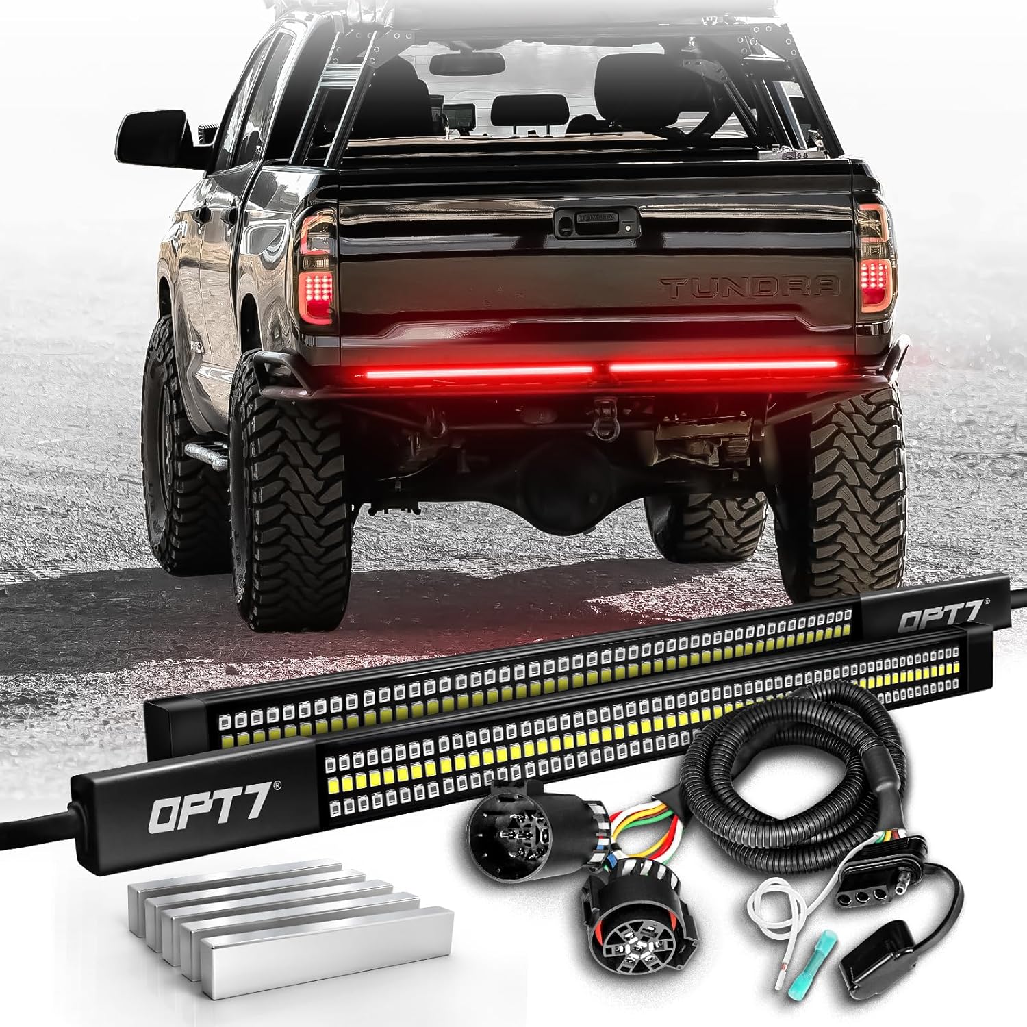 OPT7 Plug'n'Play Bundle for 2007-2021 Tundra – Redline Triple Row Two-Piece LED Tailgate Light Bar w/Sequential Red Turn + Easy Connect Harness + 5pcs Easy-Install Neodymium Magnets