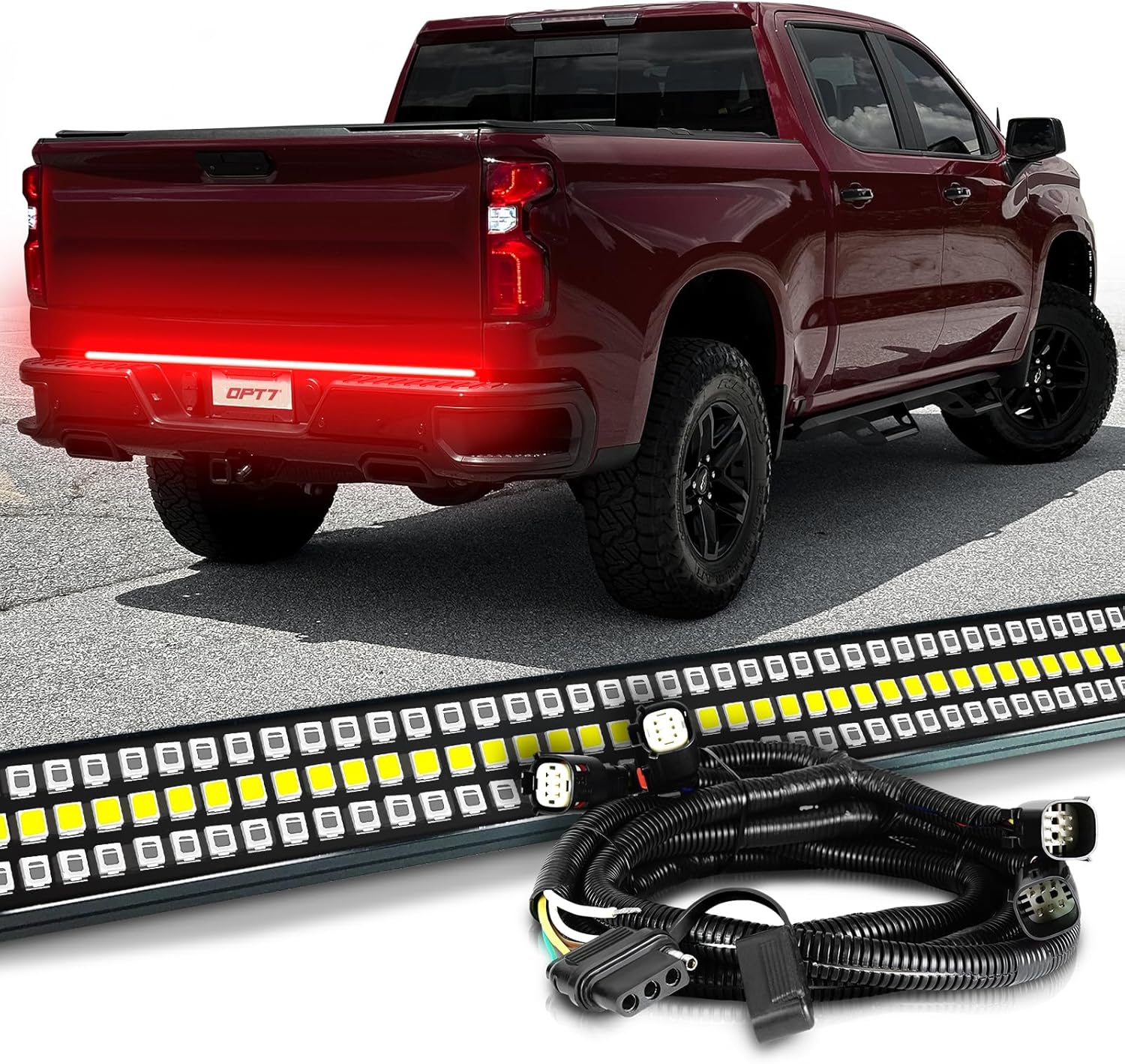 OPT7 Plug'n'Play Bundle for 2019-2021 Chevy Silverado/GMC Sierra 1500 – 60" Redline Triple Row LED Tailgate Light Bar w/Sequential Red Turn + Easy Connect Harness