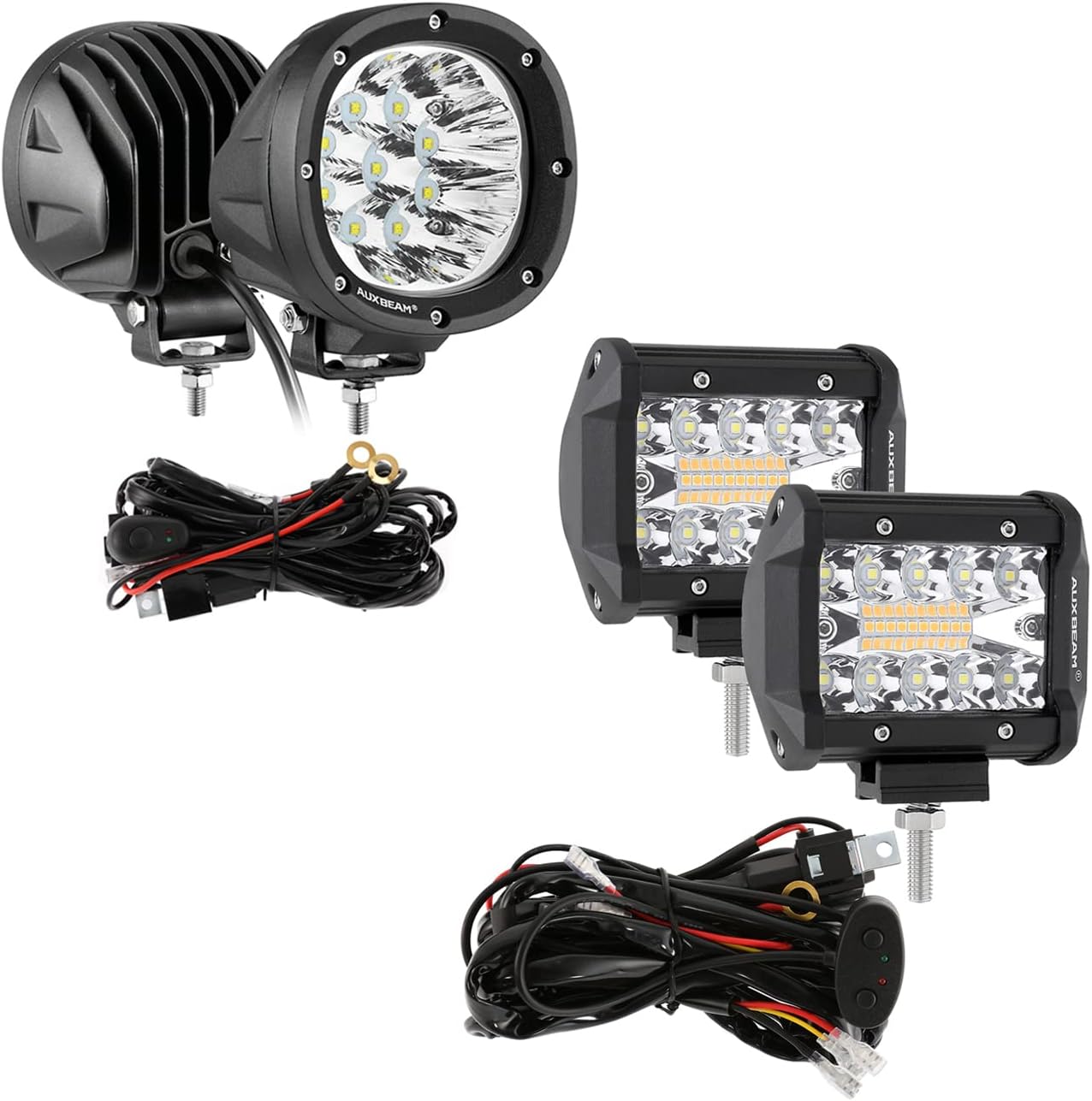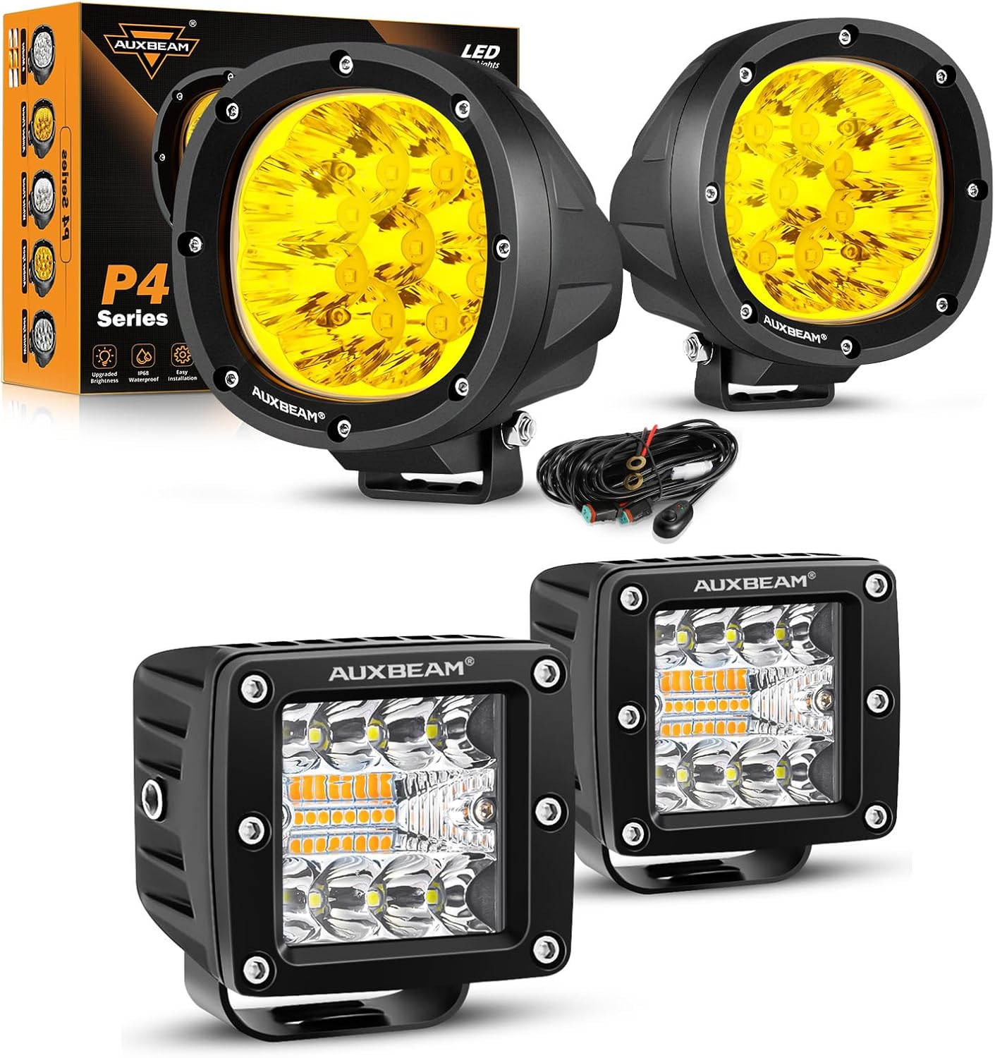 Auxbeam 4In 90W Amber Round Led Offroad Lights with Wiring Harness Kit + 3 Inch 72W Cube Light Pod with Strobe, Spot Flood Amber White Led Pod 10FT Custom Wiring Harness Kit with Memory Function