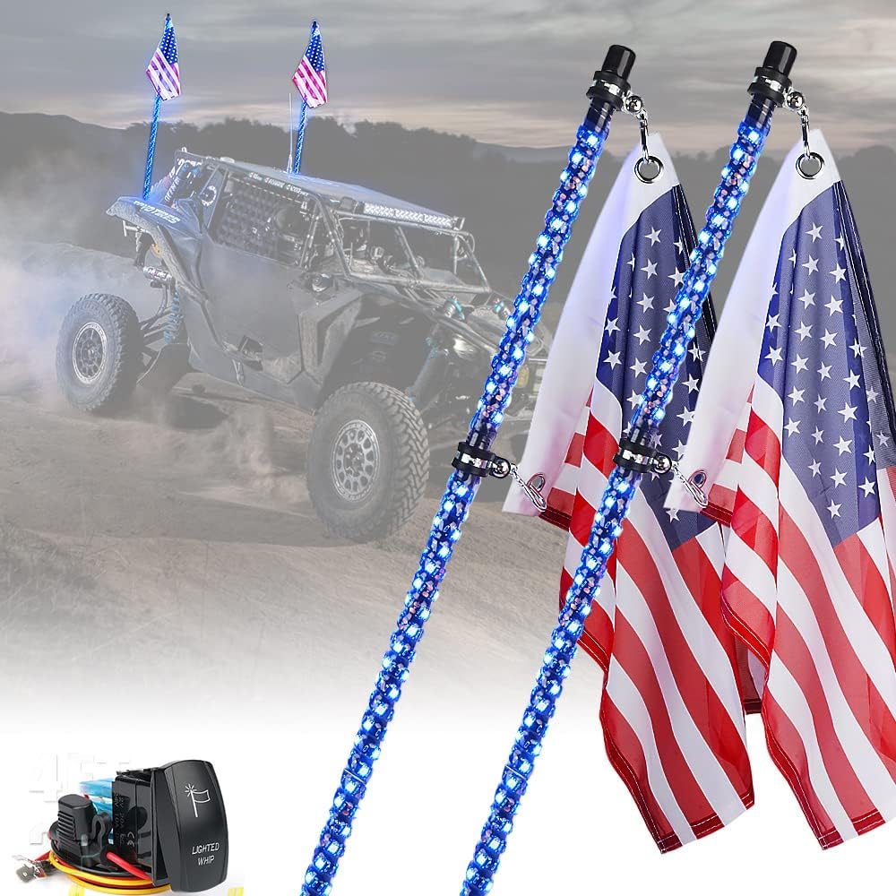 Xprite 4FT Blue LED Spiral Whip Lights, 2PCS Safety Warning Flexible Whips Pole Lighted Antenna w/U.S. Flag for Side by Side Buggy Dunes Off-Road UTV ATV Yamaha Polaris RZR Can-Am 4X4 Trophy Trucks