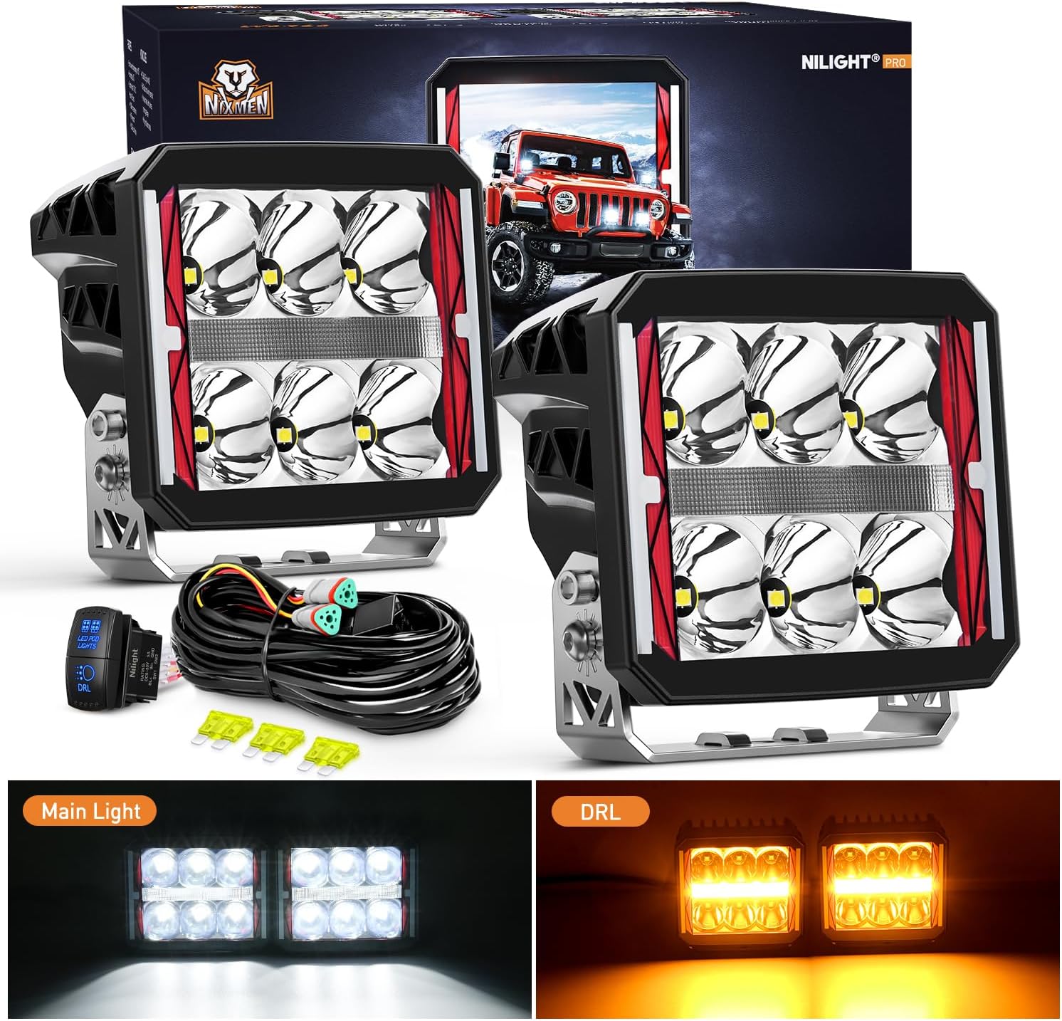 Nilight LED Pod Lights Heated Lens with Amber DRL 4 Inch 60 W Square Super Spot Light 16AWG Wiring Harness Kit for Offroad Driving Light Anti Freeze Function LED Work Lights for Truck UTV ATV SUV Jeep