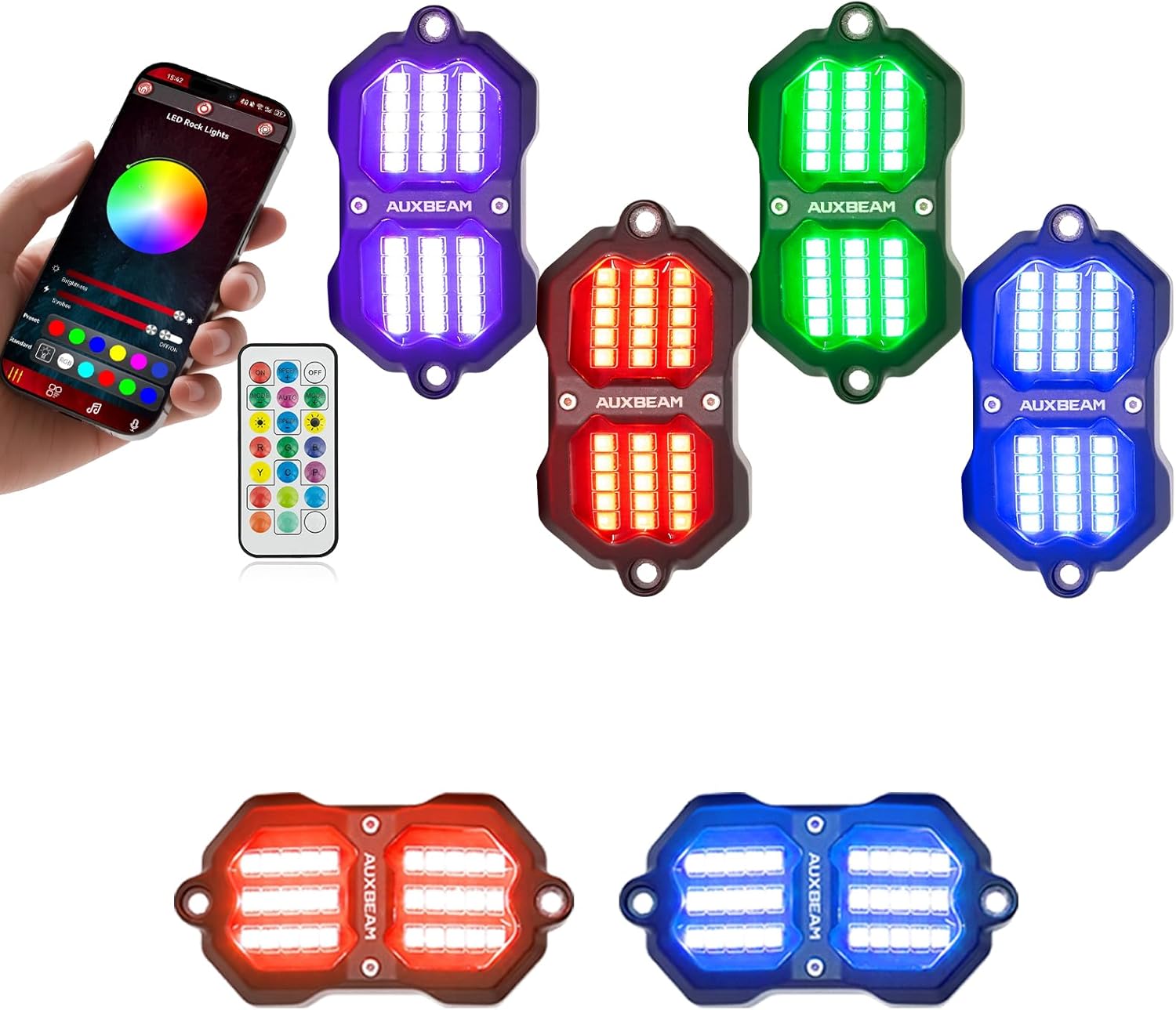 Auxbeam 4 Pods Dynamic RGB LED Rock Lights w/Bluetooth APP Remote Control + 2-Pod Rock Lights Extension Kit