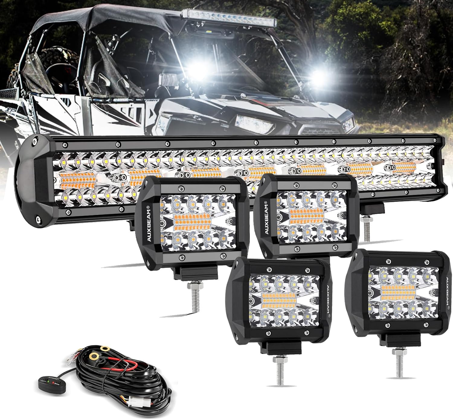 Auxbeam 6 Modes LED Pods Light Bar, 4x4 Inch 60W LED + 20 Inch 420W Amber White Strobe Light with 10FT Wiring Harness Kit-5PCS