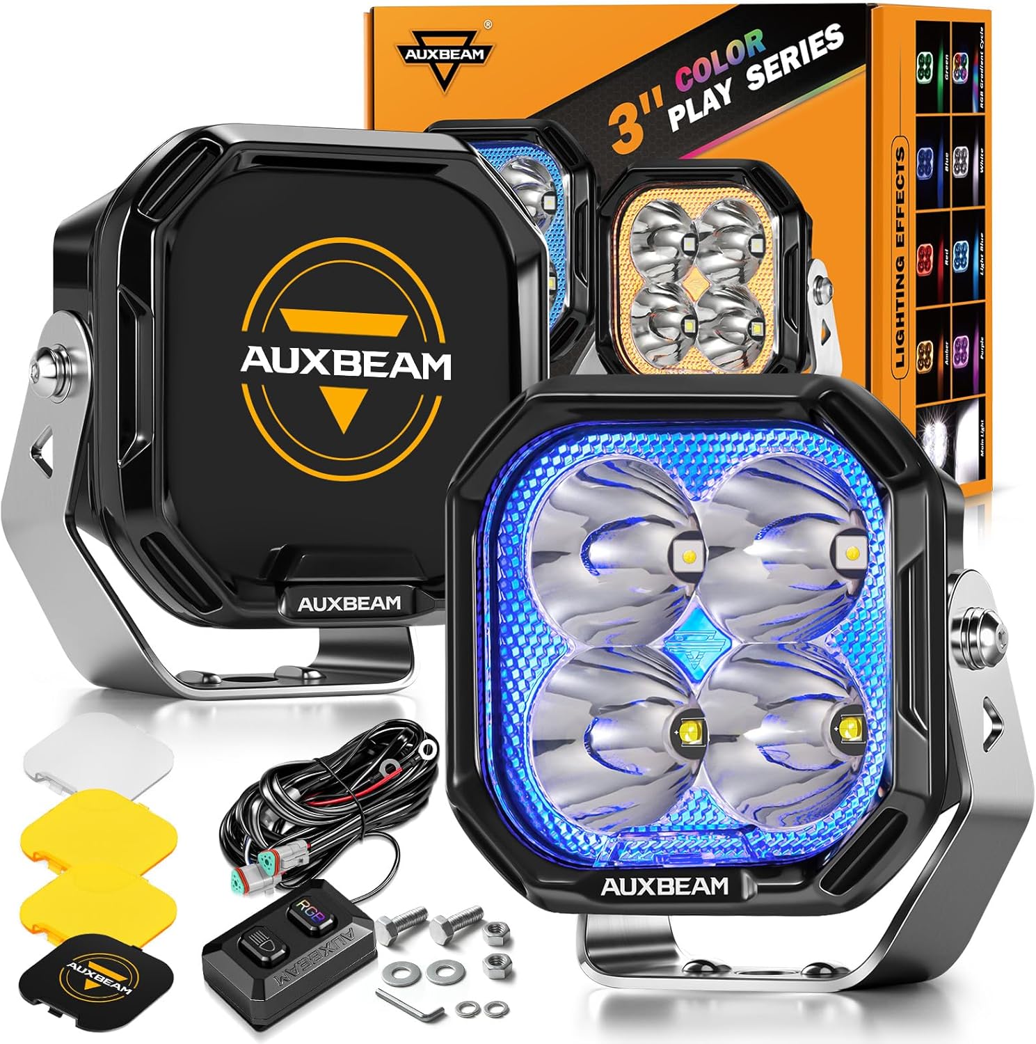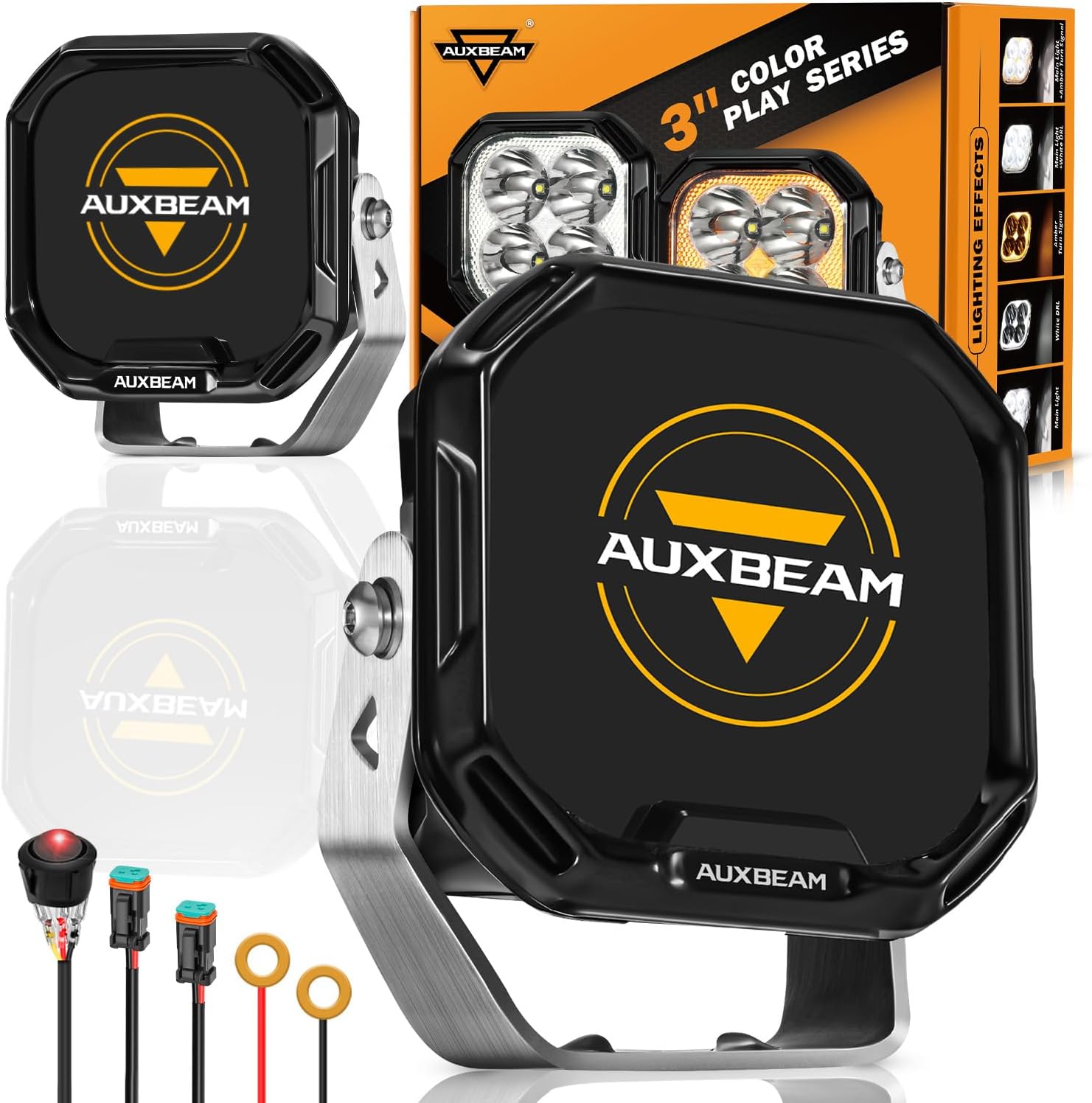 Auxbeam Color Play Series 3" LED Pods Spot Flood Combo Beam with Protective Covers Bundle, Amber White DRL & Turn Signal Multi-Modes Cube Off-Road Fog Lights Automotive Light Bar (ZD000867, ZD000864)