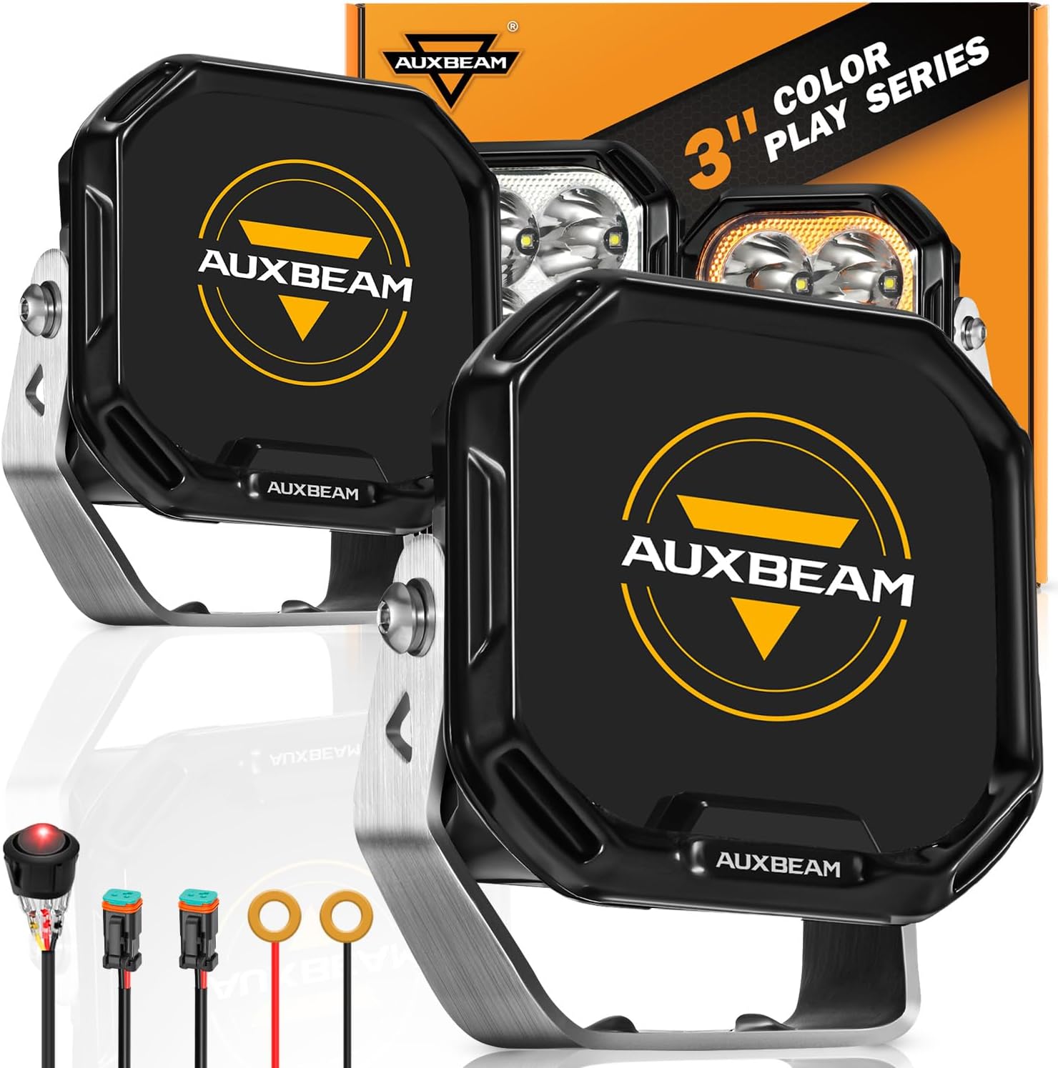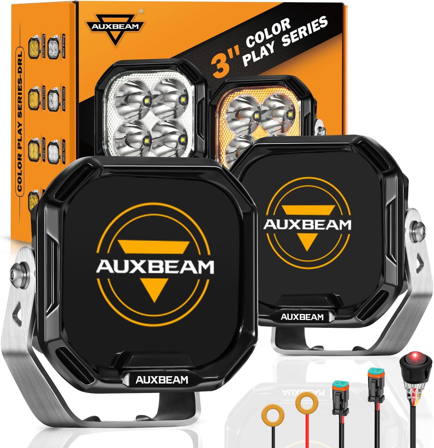 Auxbeam Color Play Series 3 Inch LED Pods Spot Beam with Protective Covers Bundle, Amber White DRL & Turn Signal Multi-Modes Cube Off-Road Fog Lights Automotive Light Bar (ZD000865, ZD000864)