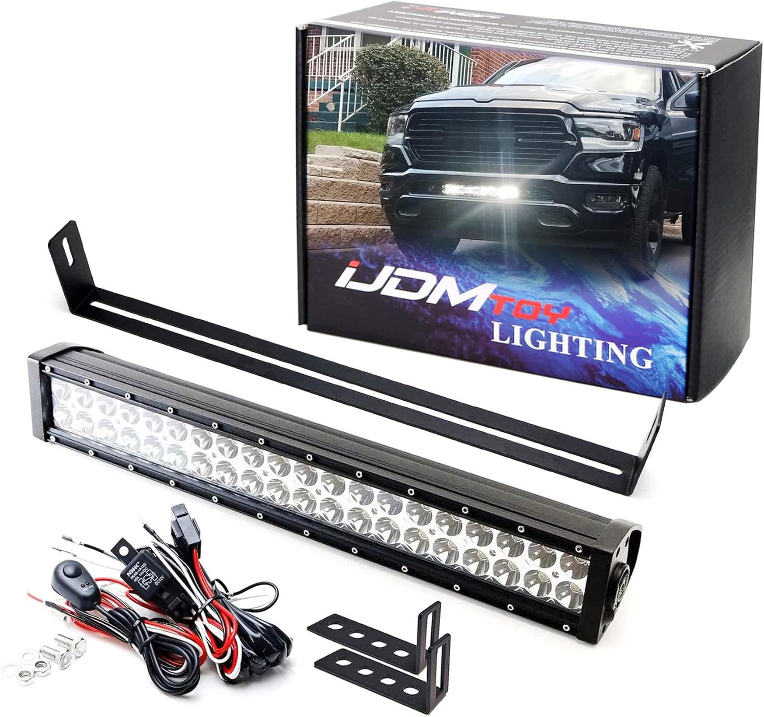 iJDMTOY Lower Grille Opening Mount 20-Inch LED Light Bar Compatible with 2020-up RAM 2500 3500, Includes 120W High Power LED Lightbar, Behind Lower Bumper Mesh Mounting Brackets & On/Off Switch Relay