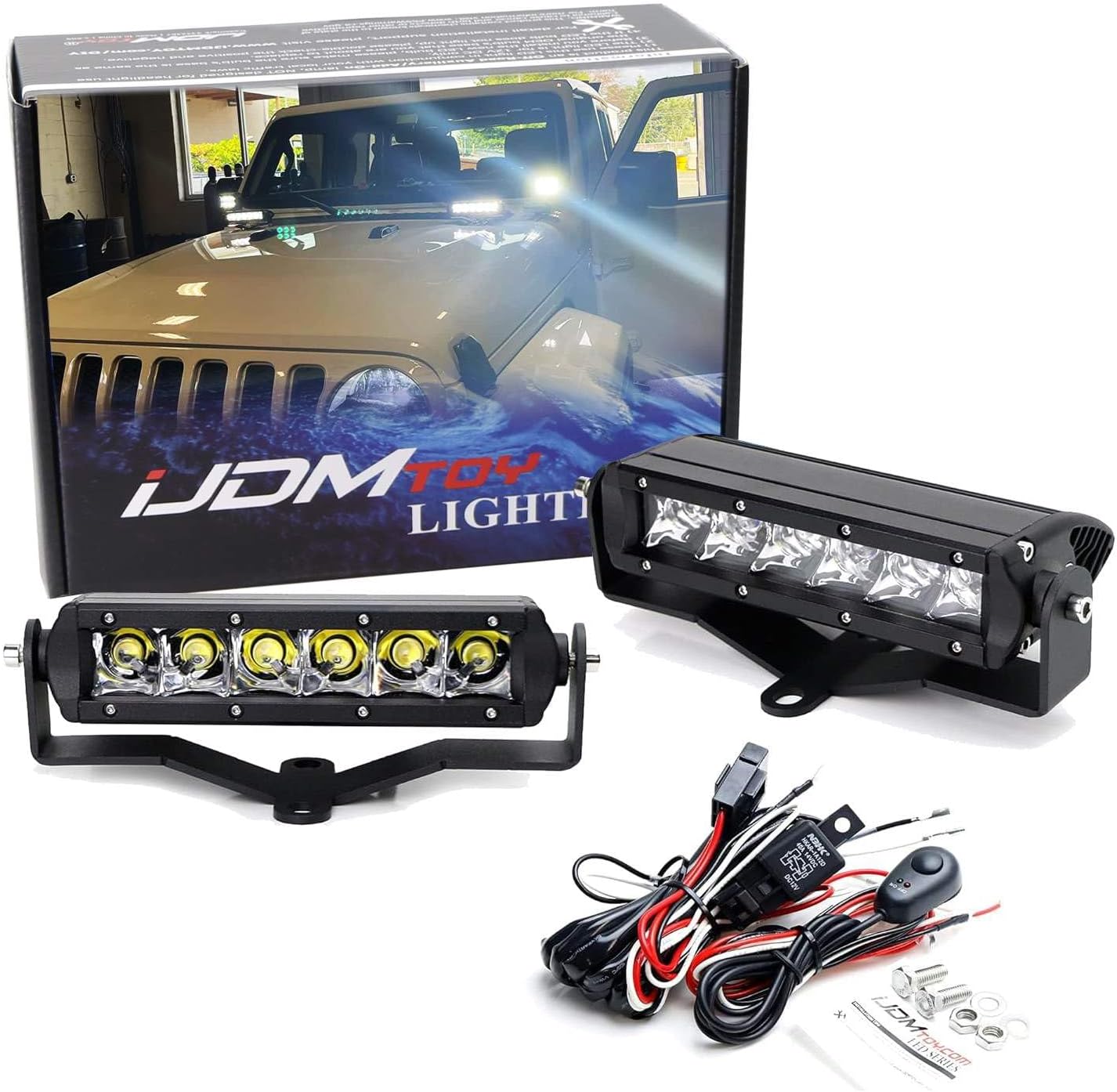 iJDMTOY Hood LED Light Bar Kit Compatible with Jeep 2007-up Wrangler JK/JL, Includes (2) 30W High Power LED Lightbars, Hood Hinge Mounting Brackets & On/Off Switch Wiring Kit