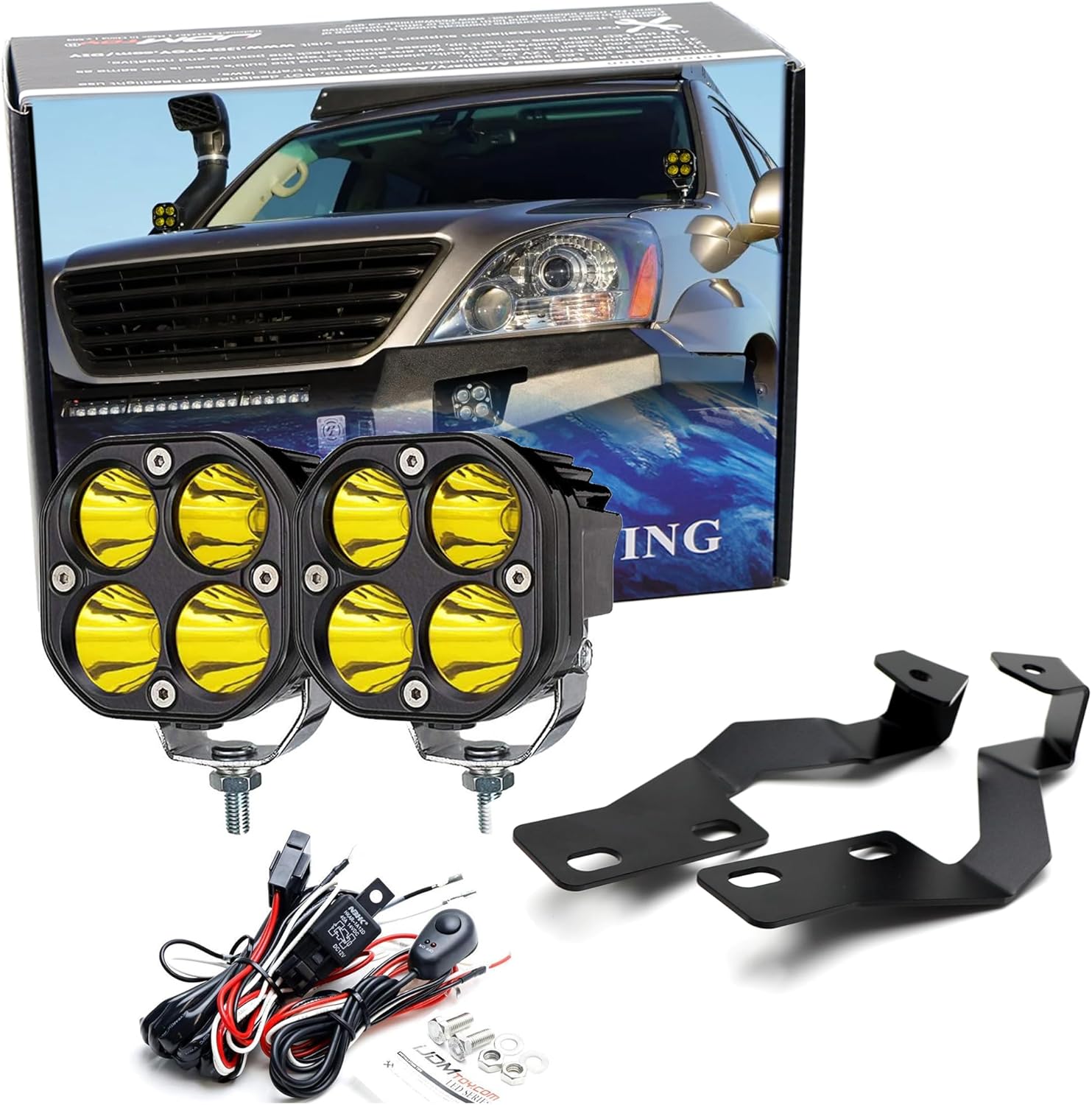 iJDMTOY Yellow Lens, Selective Yellow LED Ditch Light Bundle Compatible with 2003-2009 Lexus GX470, (2) 20W High Power LED Round Pods, Windshield A-Pillar Mounting Brackets & On/Off Switch Wiring