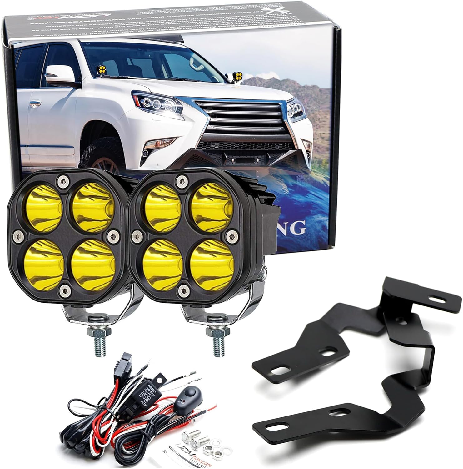 iJDMTOY Yellow Lens, Selective Yellow LED Ditch Light Bundle Compatible with 2010-2023 Lexus GX460, (2) 20W High Power LED Round Pods, Windshield A-Pillar Mounting Brackets & On/Off Switch Wiring