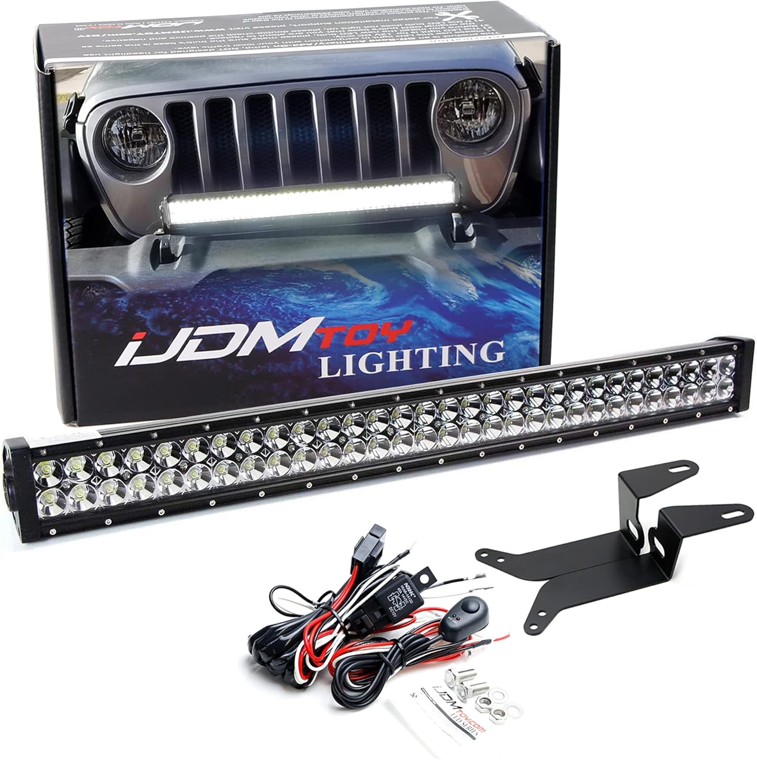 iJDMTOY Front Bumper Mount 30-Inch LED Light Bar Compatible with Jeep 2018-up Wrangler, 2020-up Gladiator, 180W High Power LED Lightbar, Bumper Top Mounting Brackets & On/Off Switch Wire